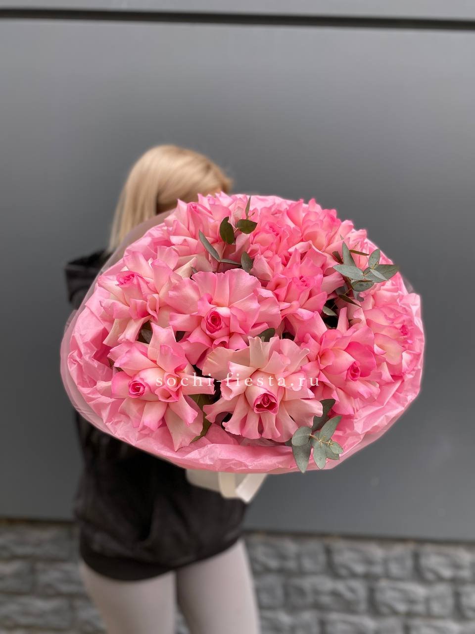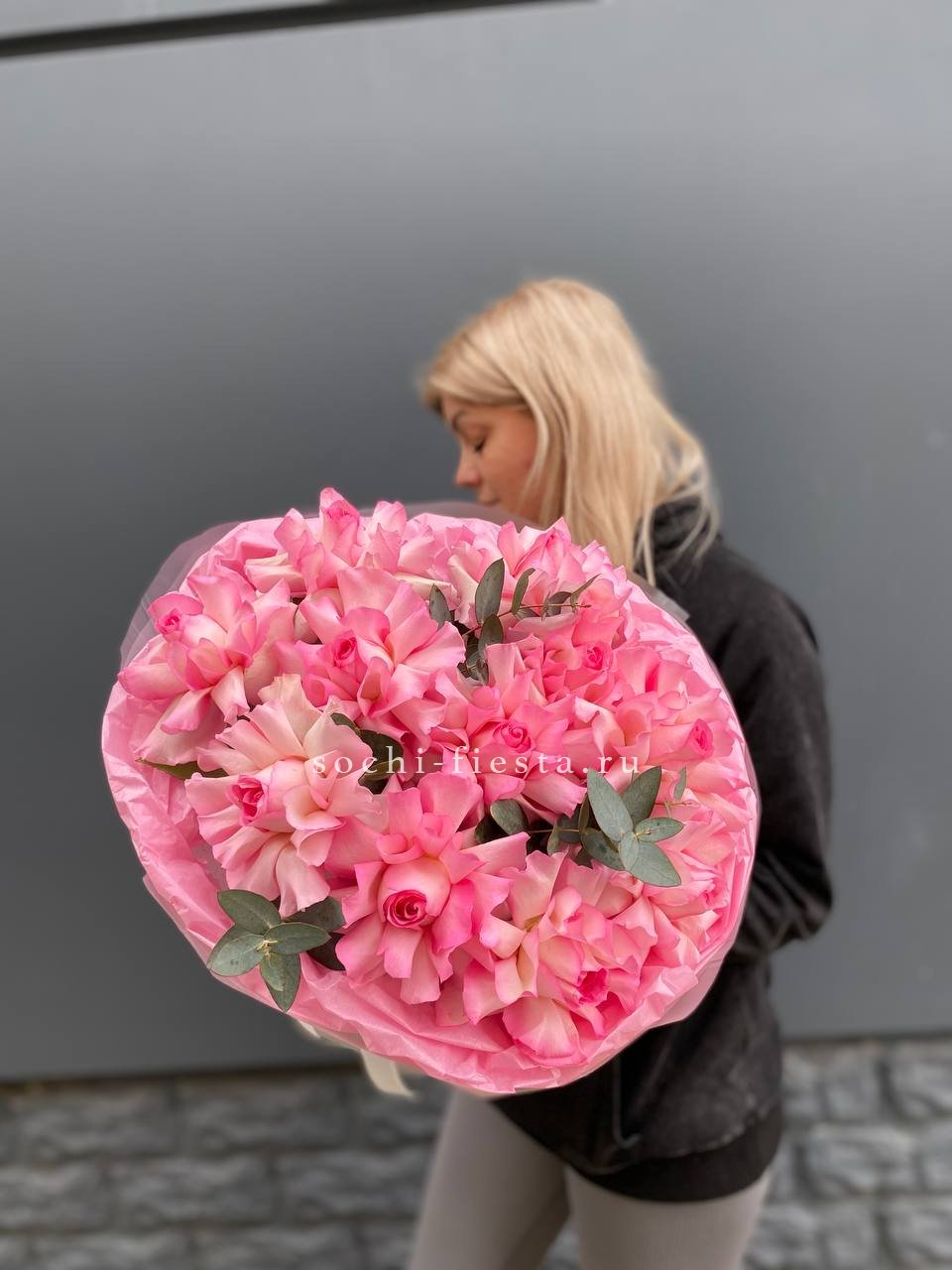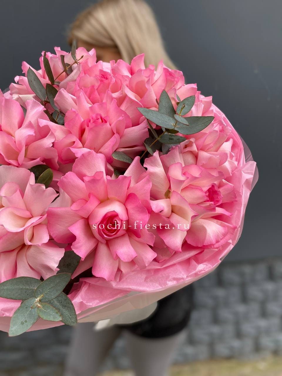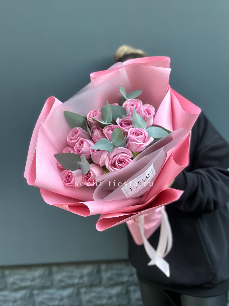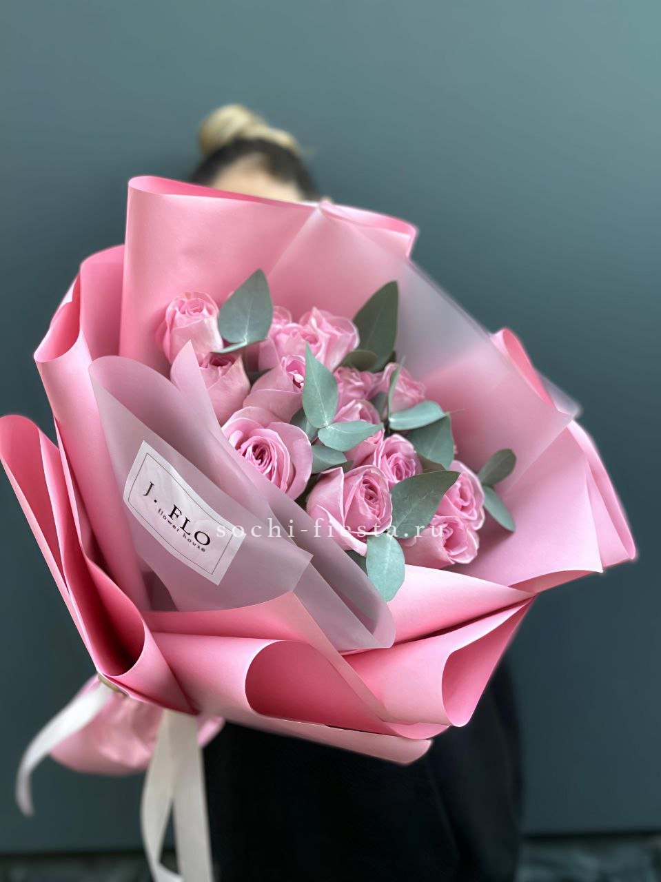 Одиннадцать французских роз выстроены в округлую композицию с веточками эвкалипта. Бутоны крупные и плотные, держат форму и наполняют пространство свежим присутствием.