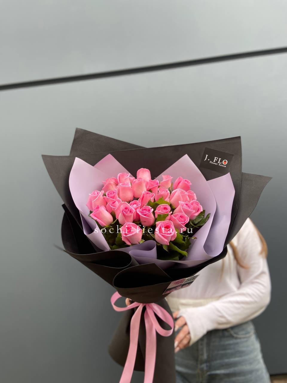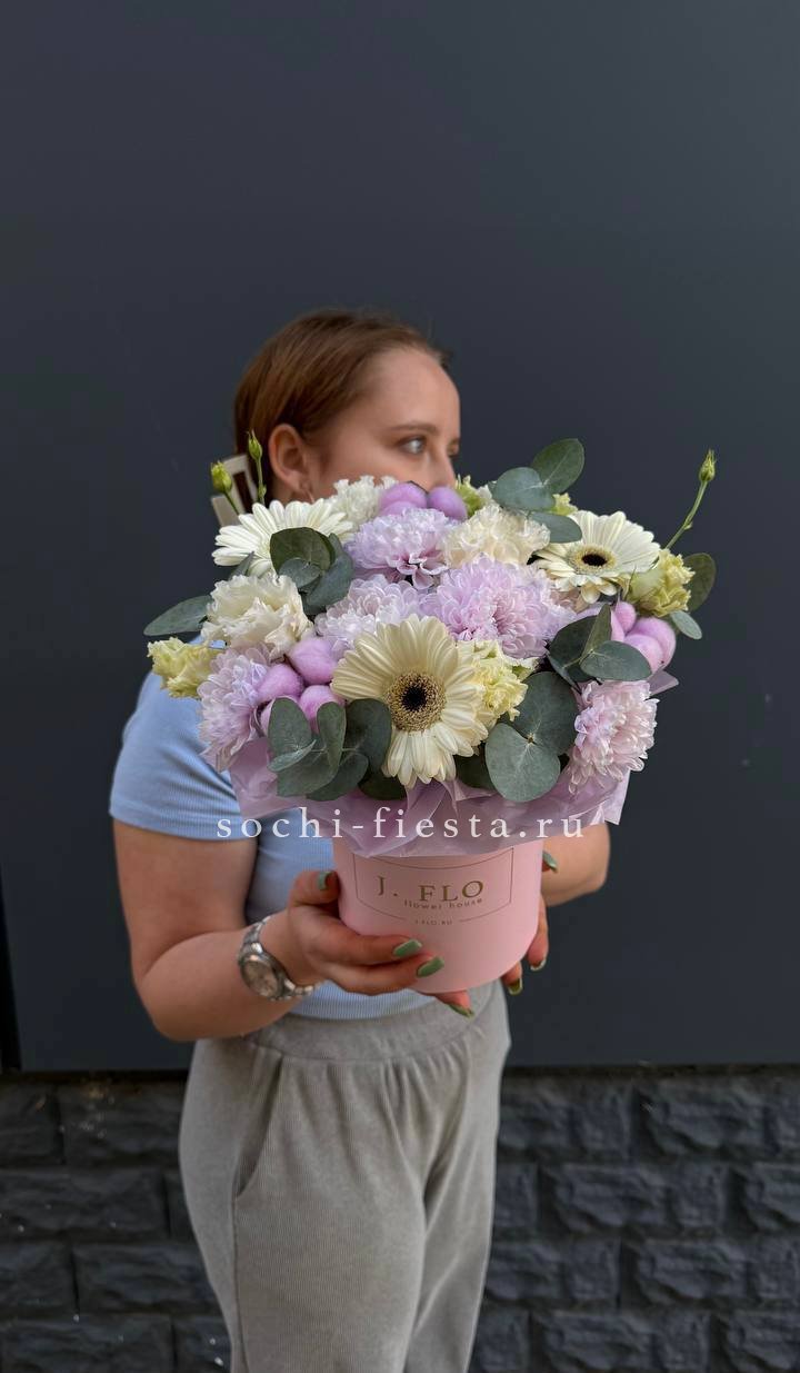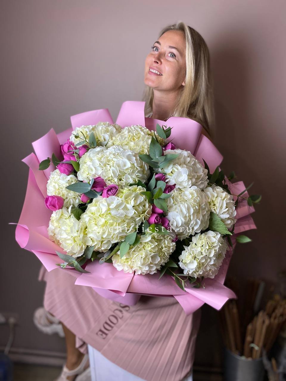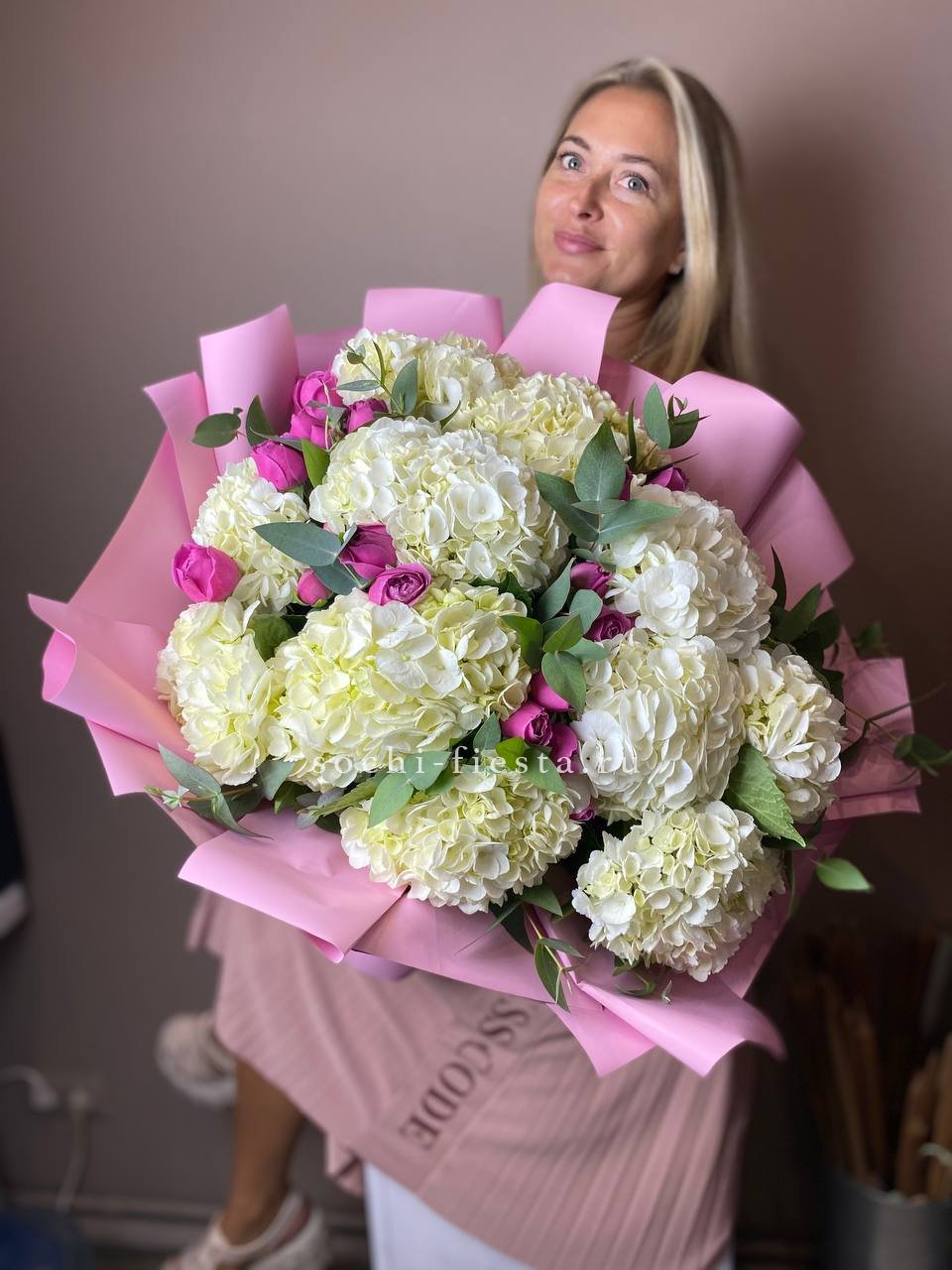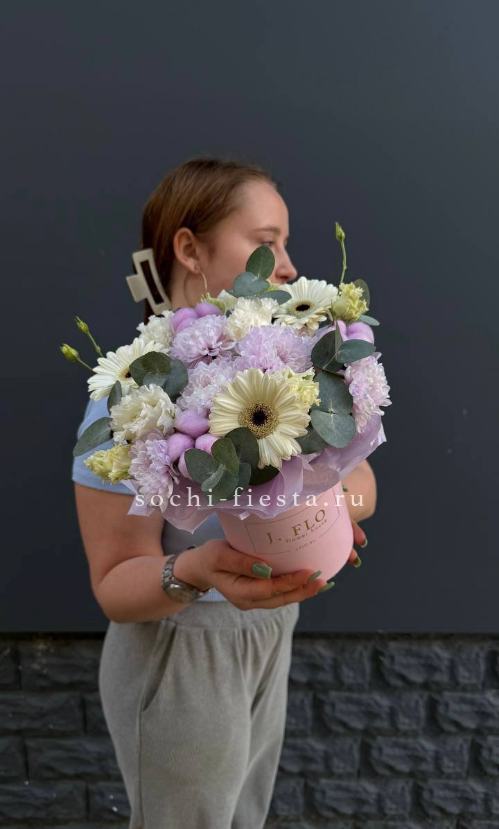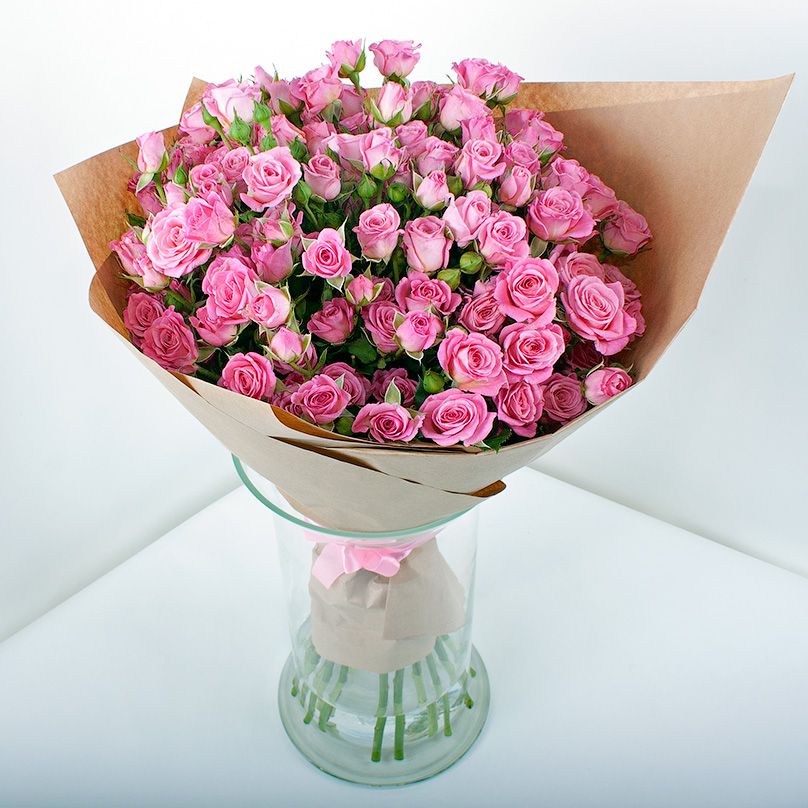 Одиннадцать французских роз выстроены в округлую композицию с веточками эвкалипта. Бутоны крупные и плотные, держат форму и наполняют пространство свежим присутствием.