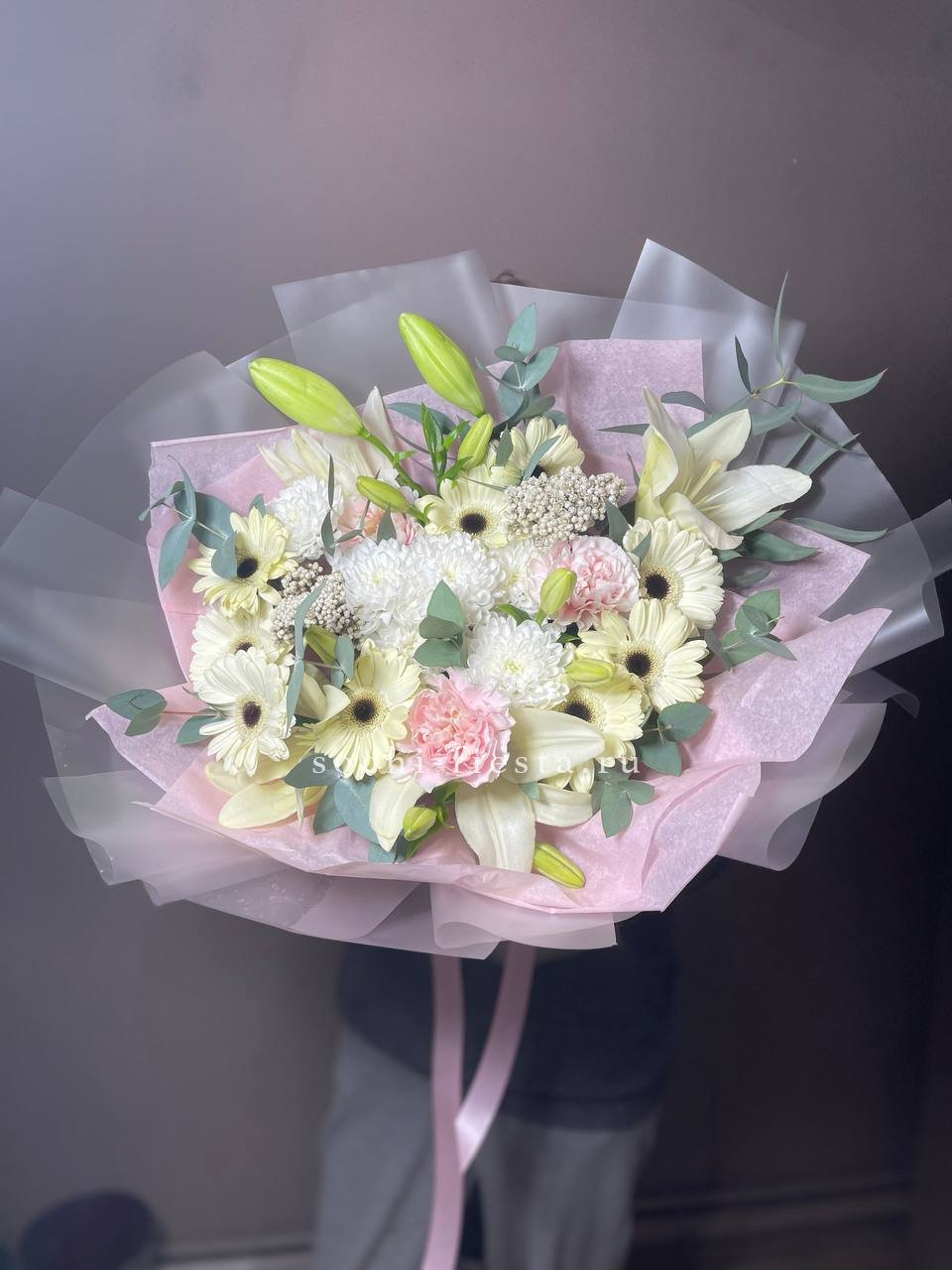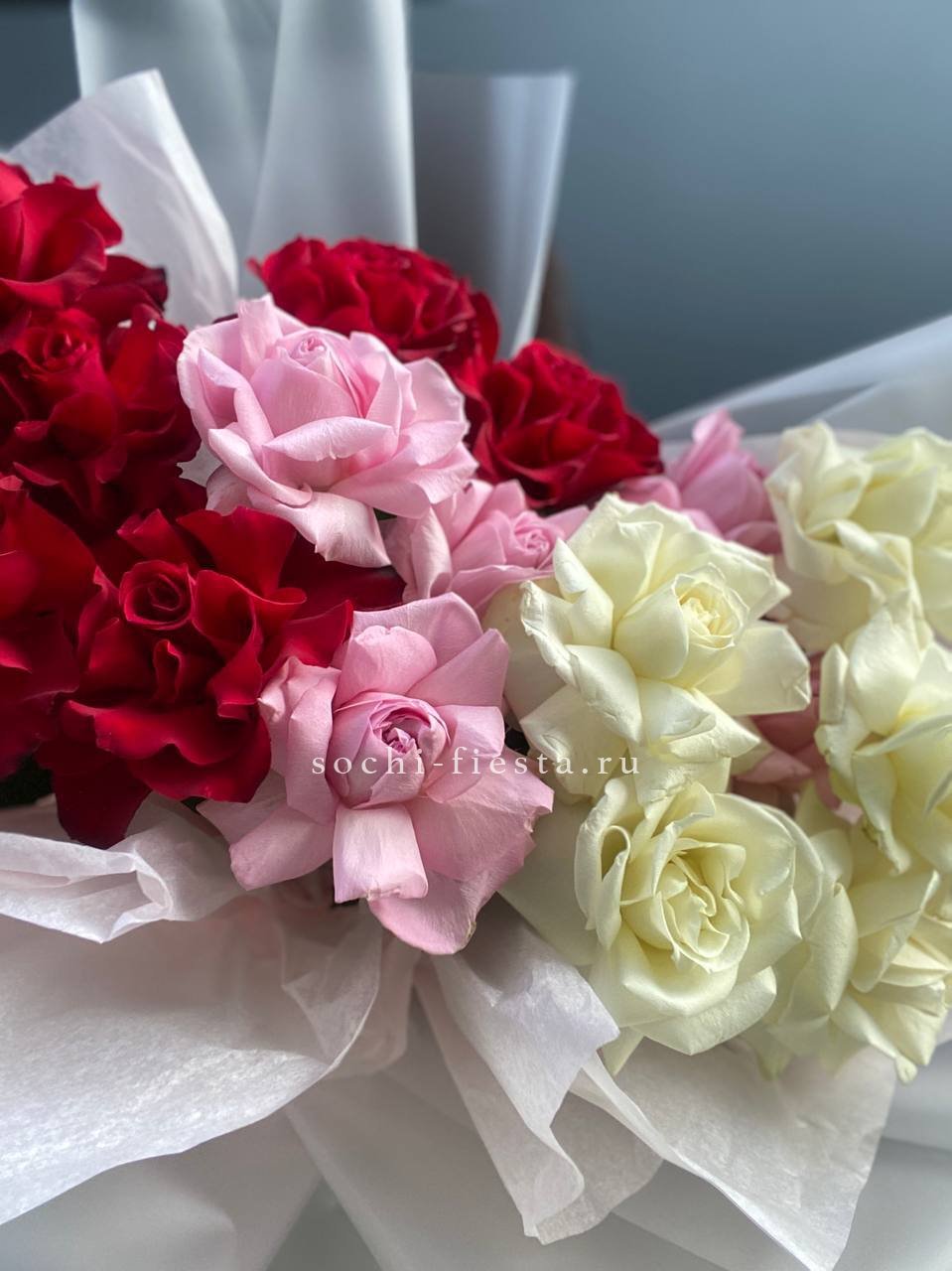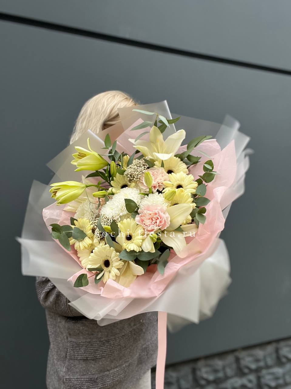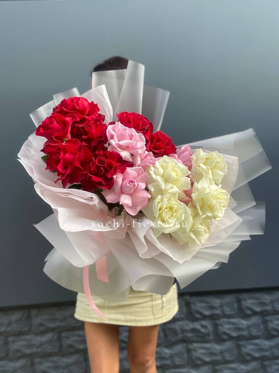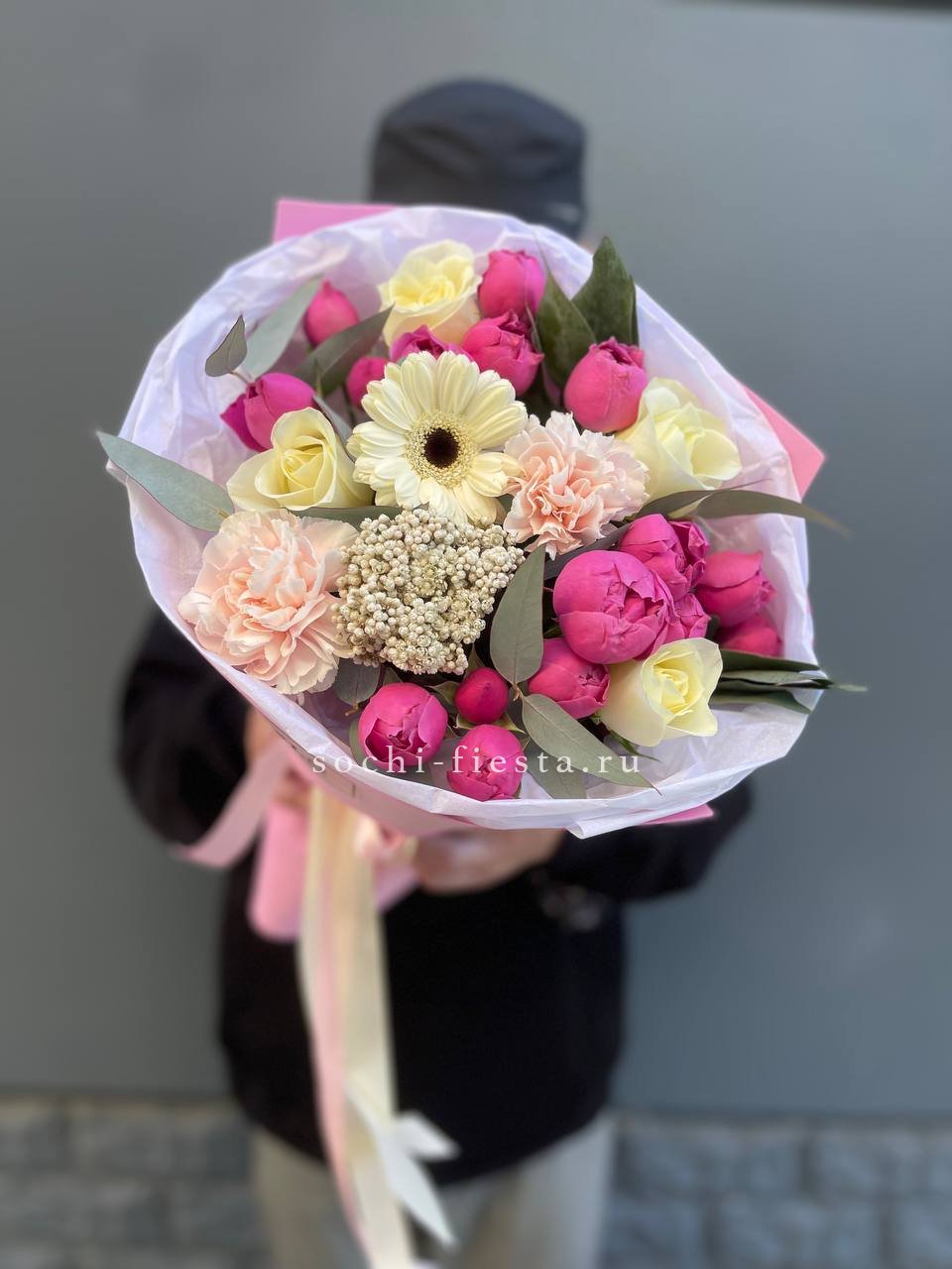 Одиннадцать французских роз выстроены в округлую композицию с веточками эвкалипта. Бутоны крупные и плотные, держат форму и наполняют пространство свежим присутствием.