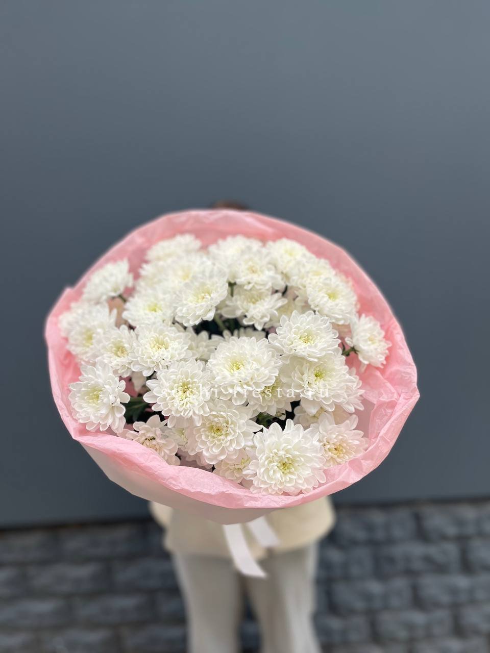 Пять кустовых хризантем собраны в лаконичный букет с мягким обрамлением. Пышные соцветия создают воздушный объем и заполняют пространство легкостью.