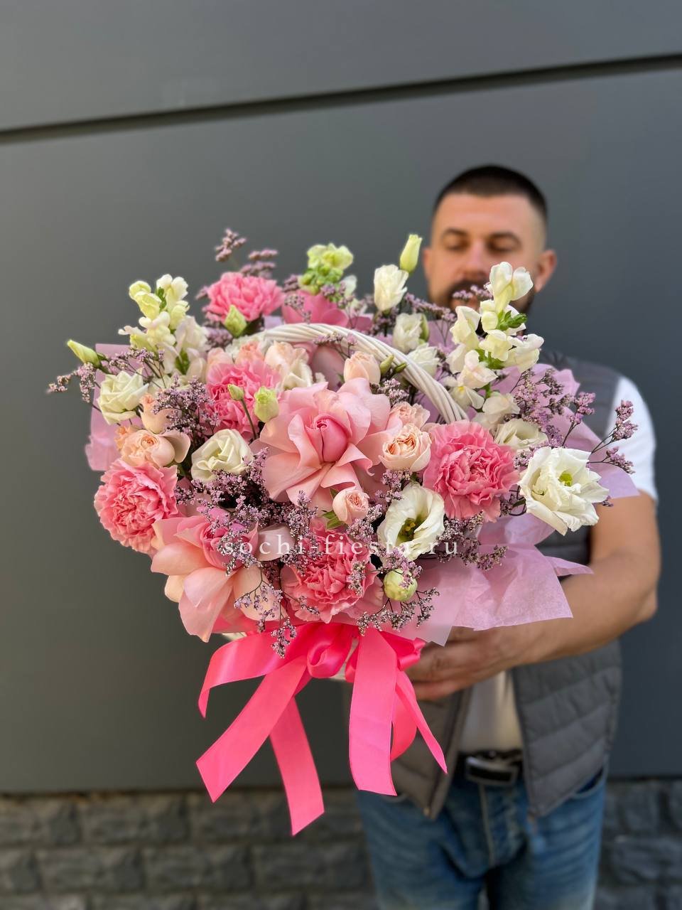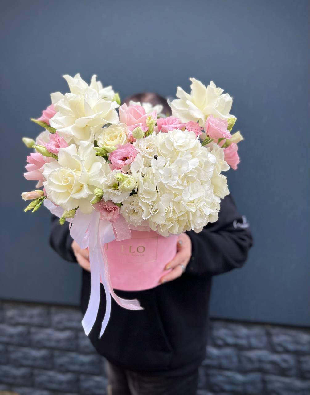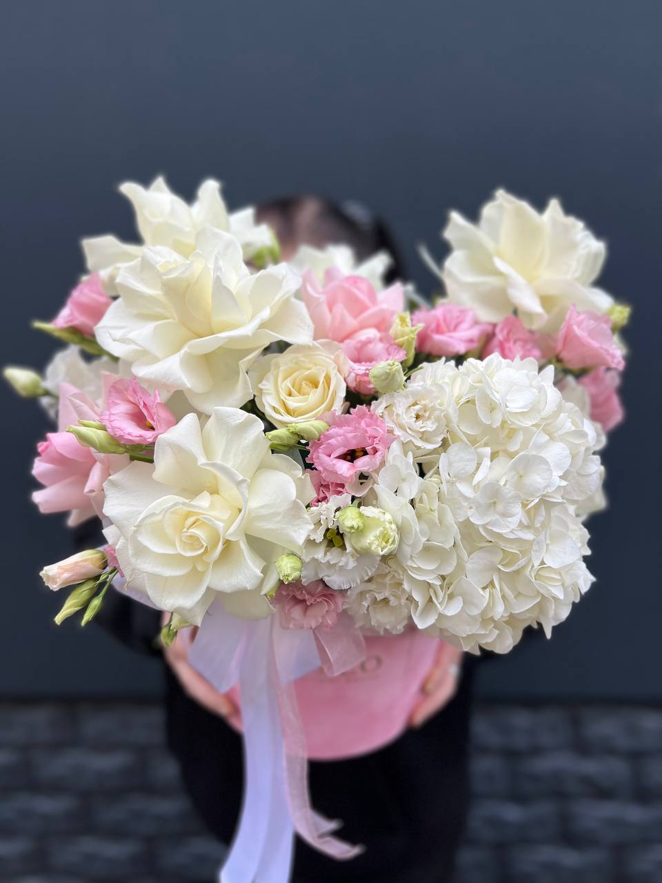 гортензия, вывернутые розы, диантус, кустовая роза, диантусы, оформление в боксе.