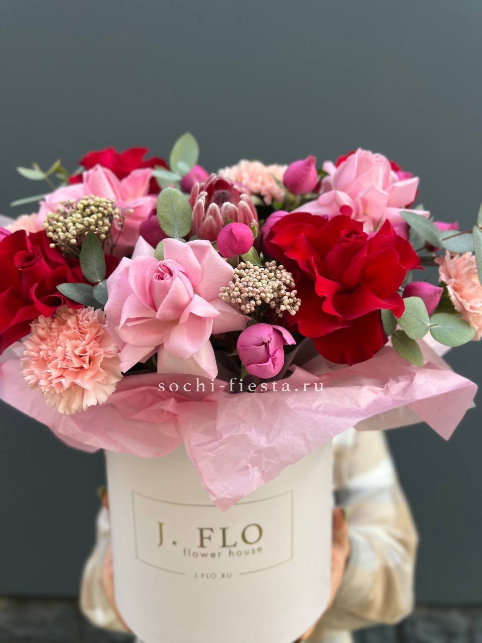 Вывернутые розы раскрывают пышную внутреннюю структуру лепестков и задают фактурный ритм композиции. Гортензия и диантусы дополняют объём воздушными соцветиями в лаконичном боксе.