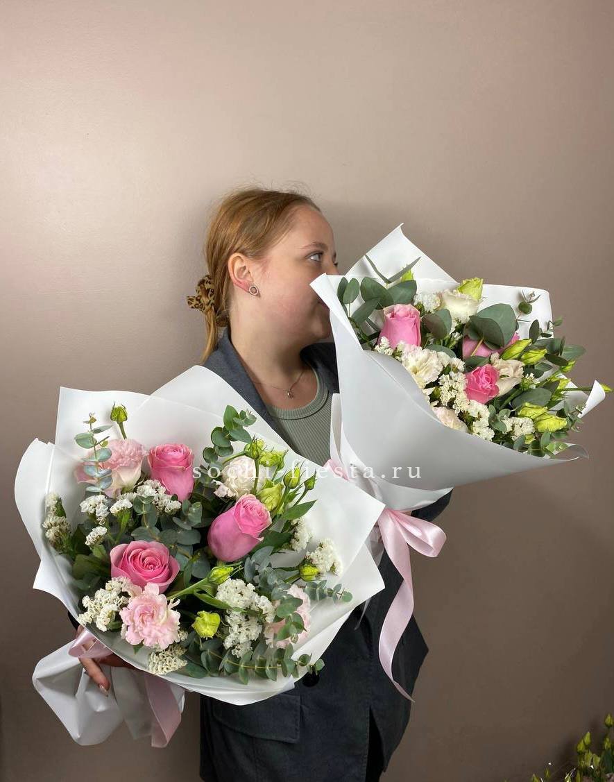 Французские и пионовидные розы белого цвета соседствуют с воздушными метёлками ковыля и соцветиями эустомы. Композиция собрана в цилиндре и помещена в джутовое кашпо для устойчивости.