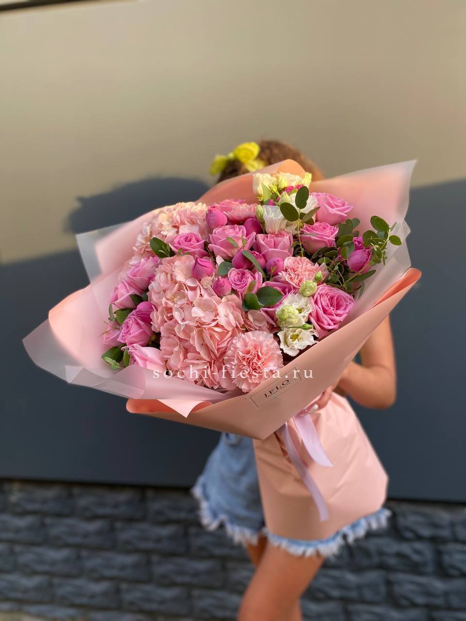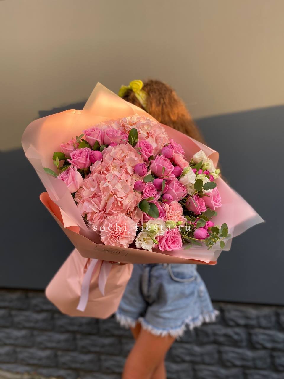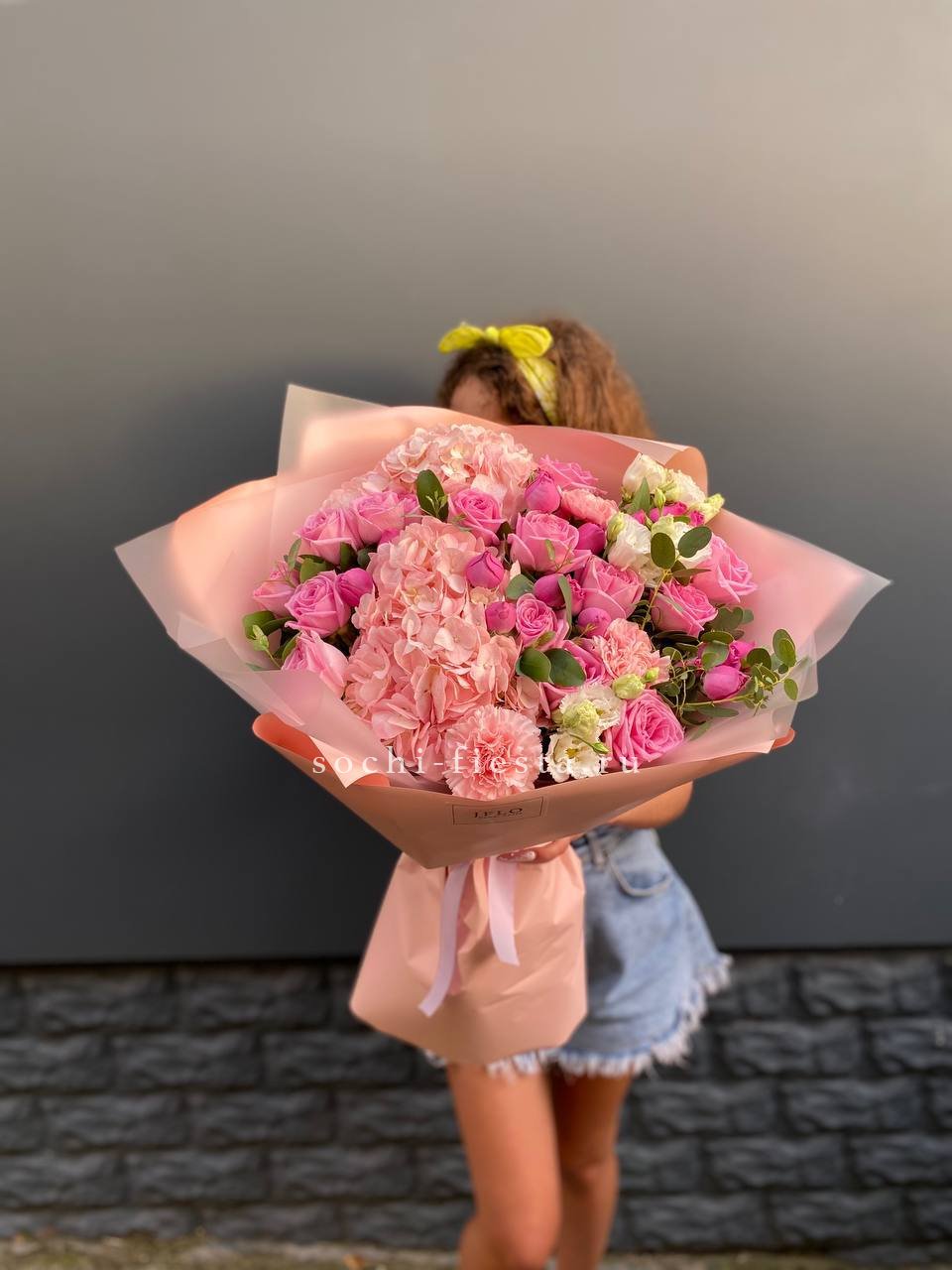 Пышная композиция объединяет крупные соцветия гортензии с бархатными розами и воздушной эустомой. Мисти бабблс и диантус создают мягкую дымку вокруг центральных бутонов. Веточки эвкалипта добавляют свежести и завершают образ.
