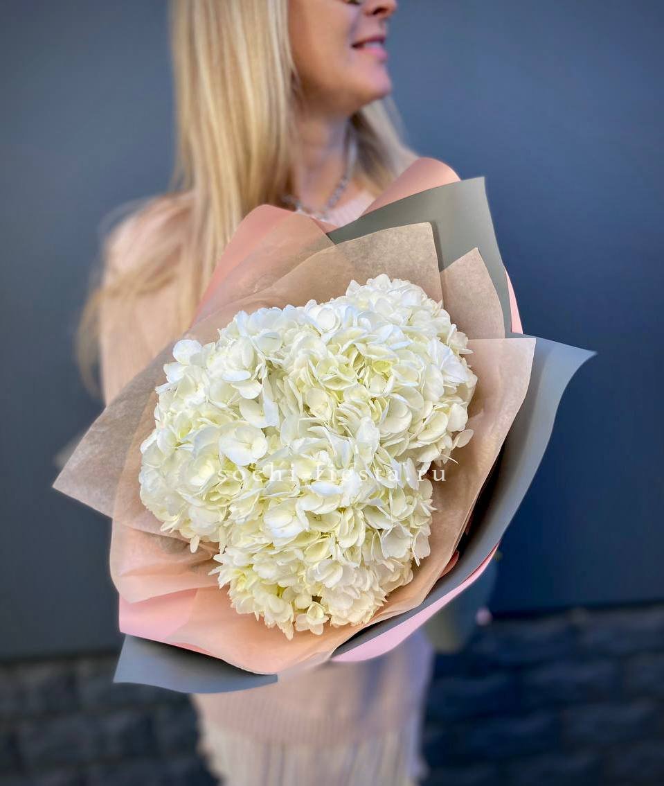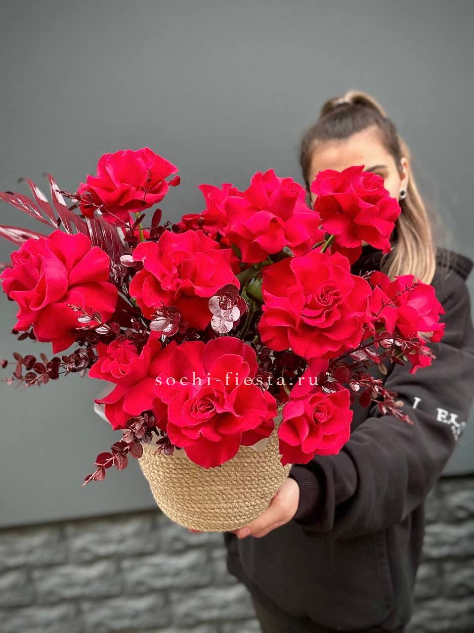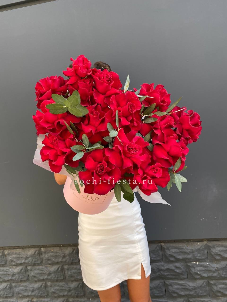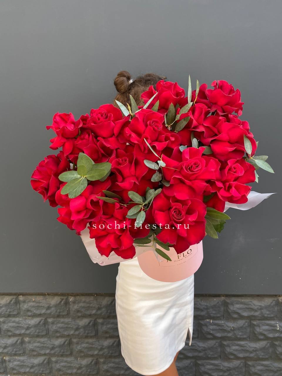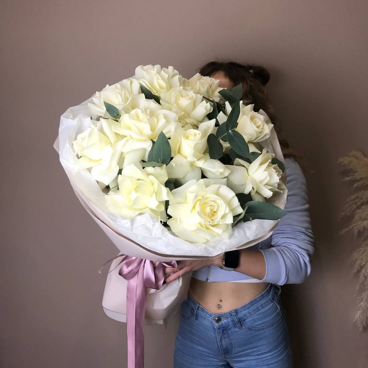 Одиннадцать вывернутых бутонов WhiteNice раскрываются волнами лепестков с матовым свечением. Эвкалипт добавляет воздуха между соцветиями. Французская селекция в лаконичной подаче.