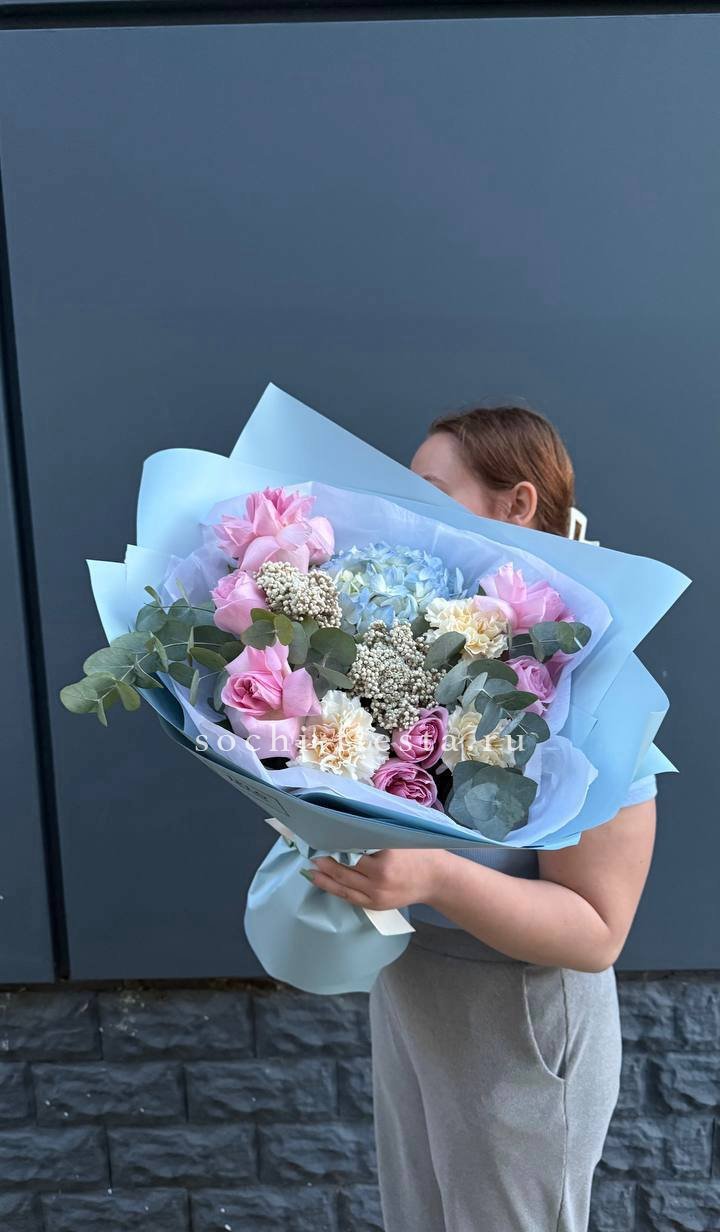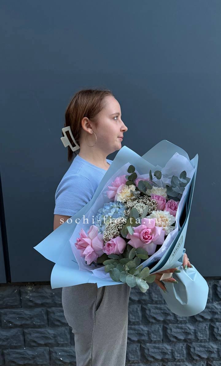 Хризантемы и розы соединяются с диантусами и маттиолой в яркой композиции. Декоративные бусины вплетаются в оформление и задают игривое настроение всему букету.