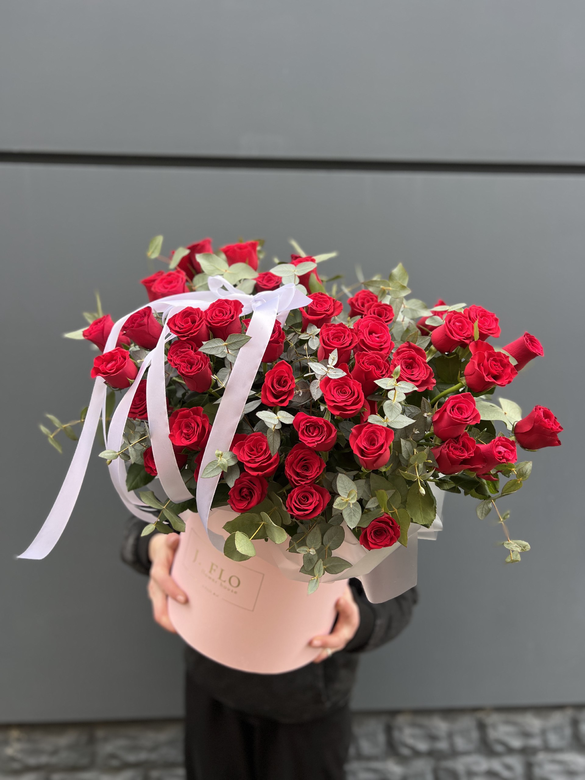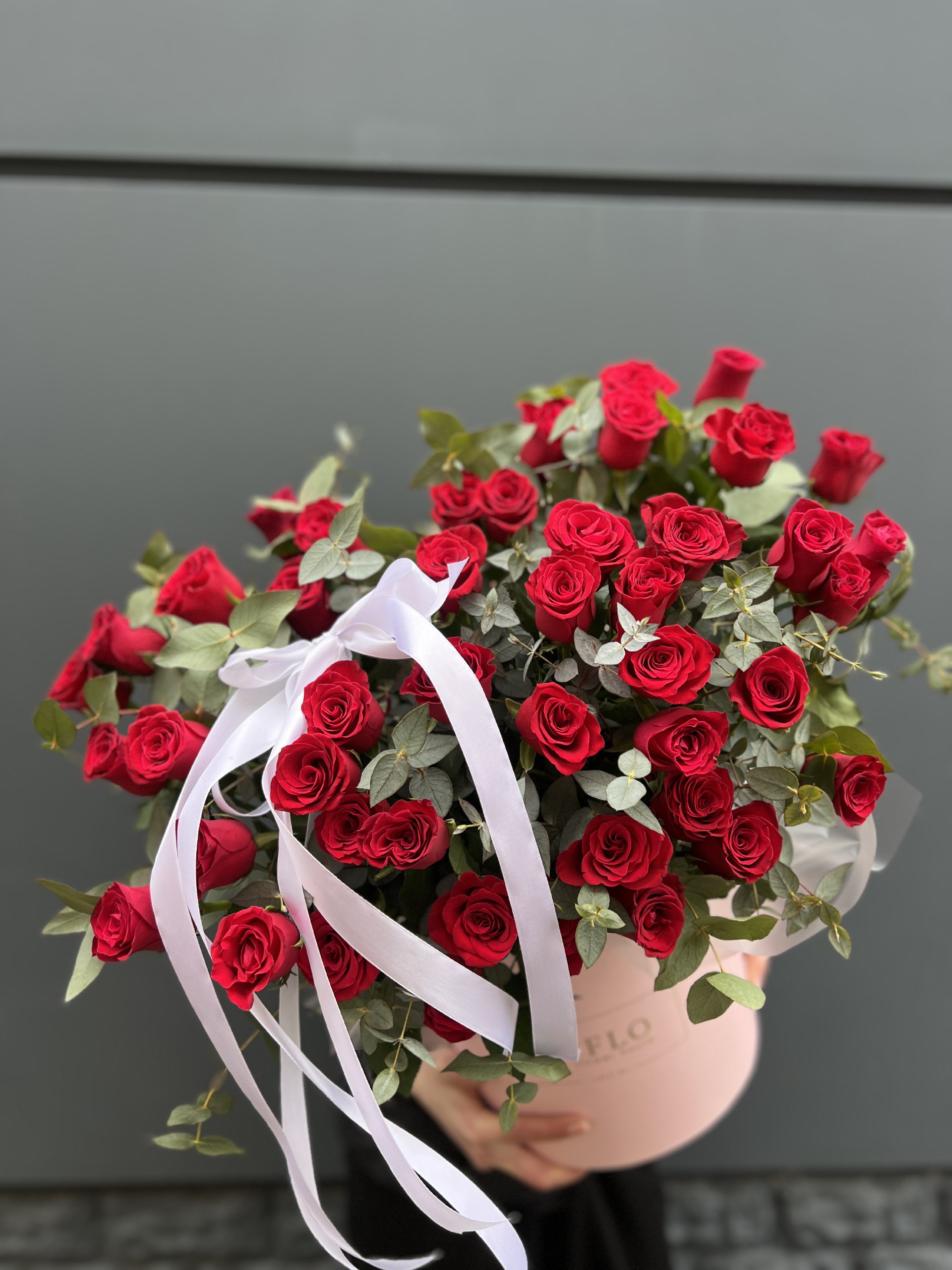 Красные розы с бархатистыми лепестками раскрываются постепенно, обнажая густую сердцевину. Каждый бутон плотный и выразительный, создавая объёмную текстуру всей композиции.