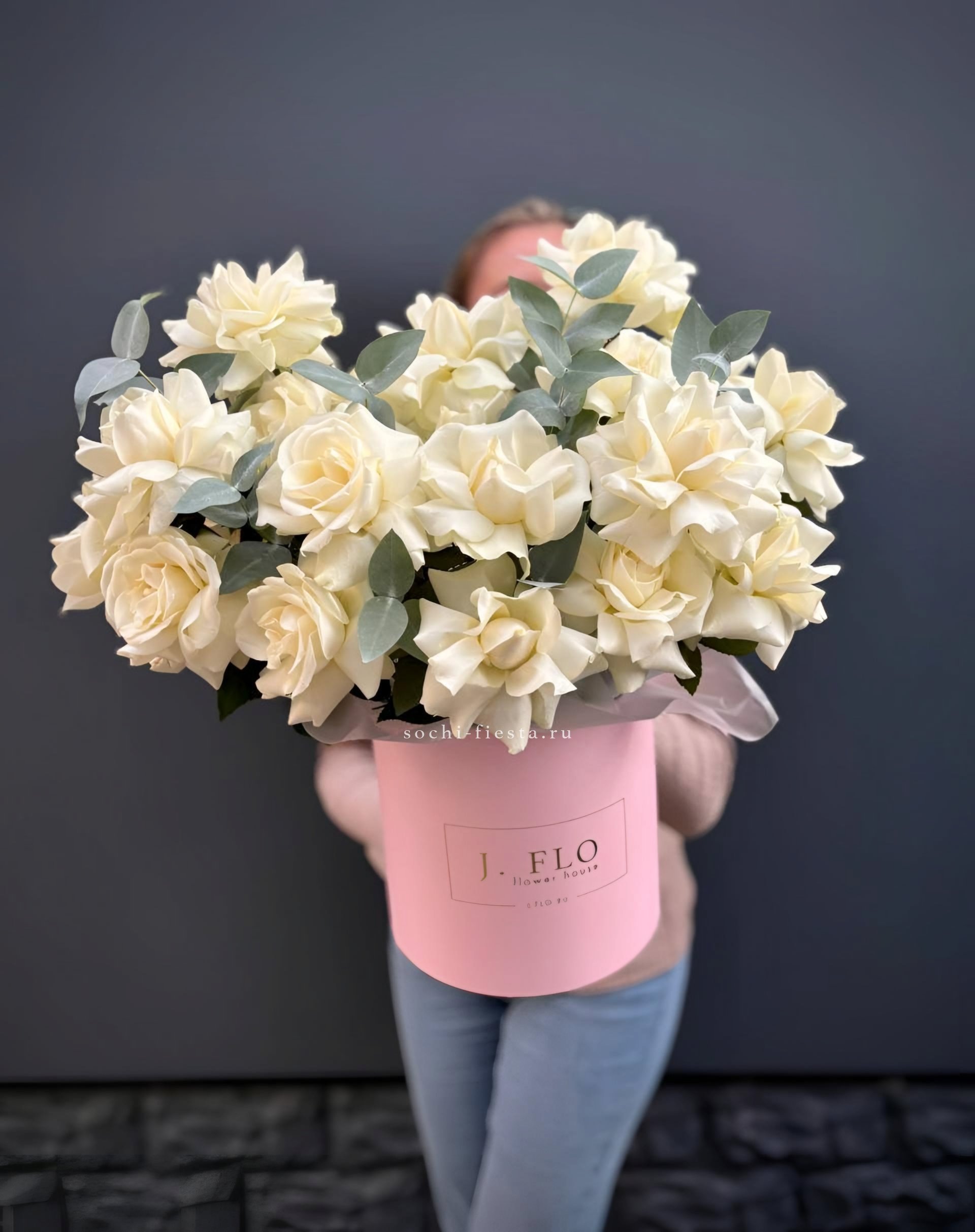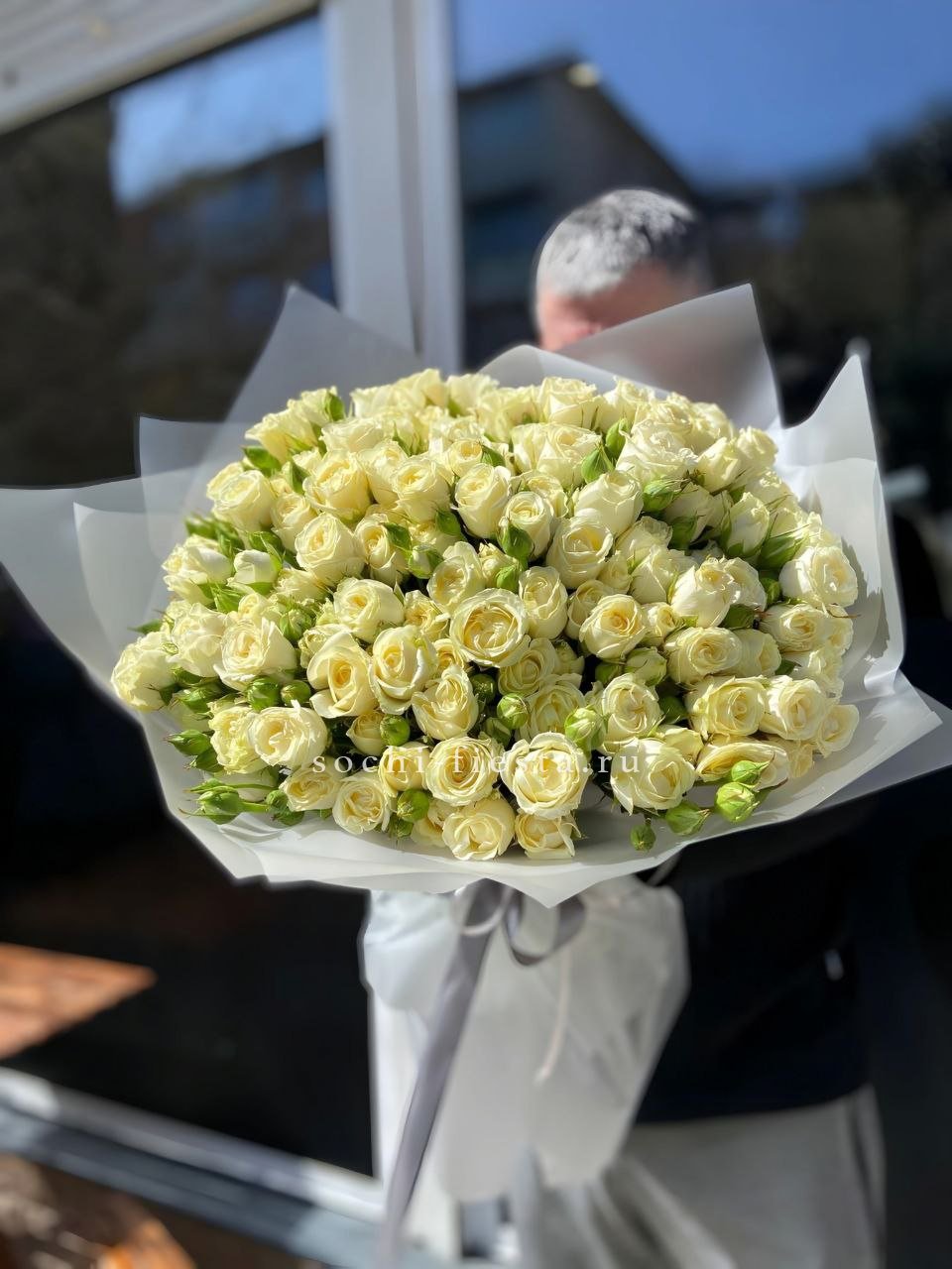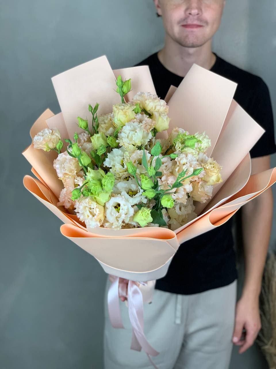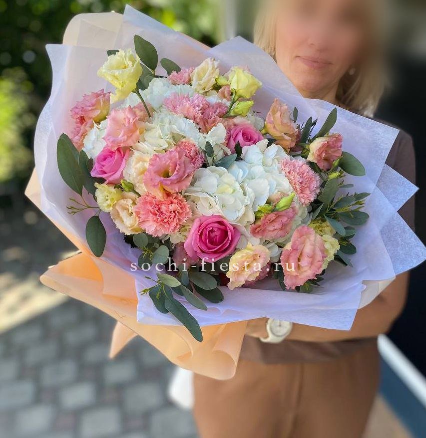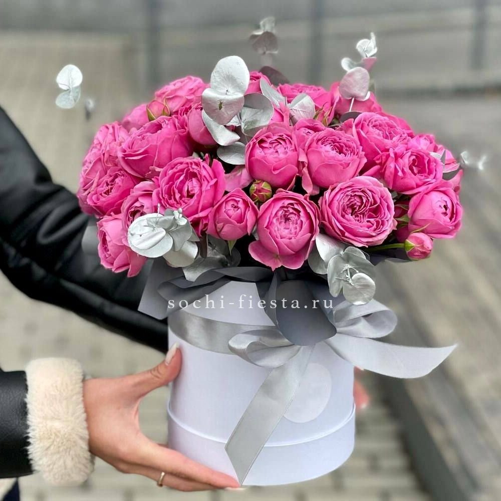 Этот букет — словно облако нежности и мечтательности. Бутончики кустовых роз, напоминающие тугие шарики, имеют светлый кремовый цвет с легким розовым оттенком. В сочетании с веточками свежего эвкалипта они создают атмосферу легкости и романтики. Это идеальный подарок для выражения самых светлых и теплых чувств, который растопит любое сердце.