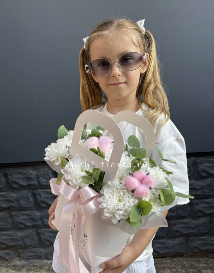 Белоснежные розы и герберы соседствуют с пушистыми шапками хризантем и воздушной статицей. Хлопок добавляет фактурный акцент, делая композицию объёмной и запоминающейся.