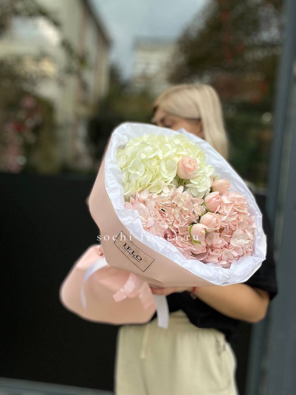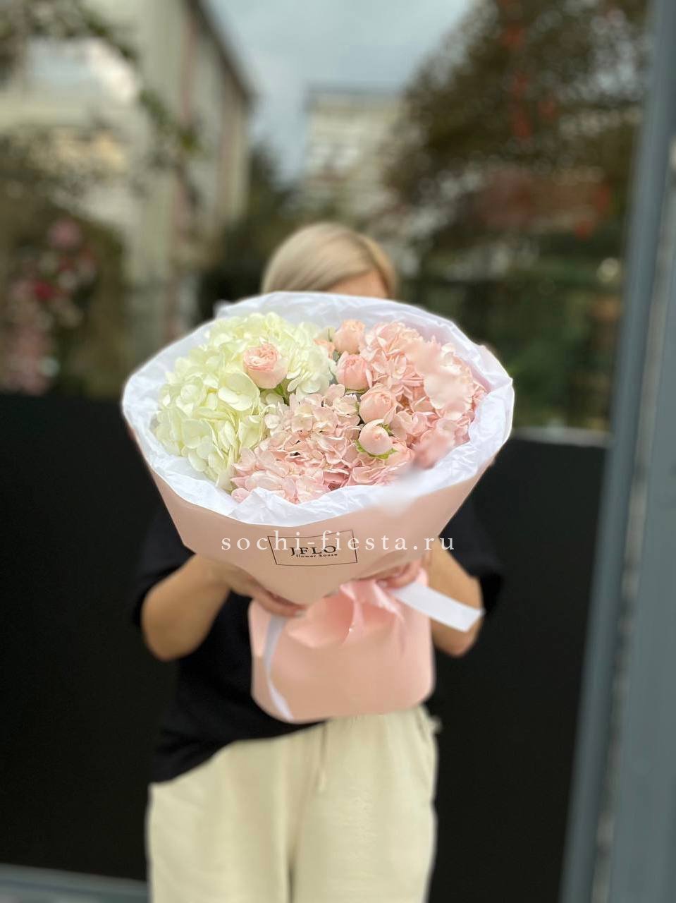 Букет из голубых гортензий и роз