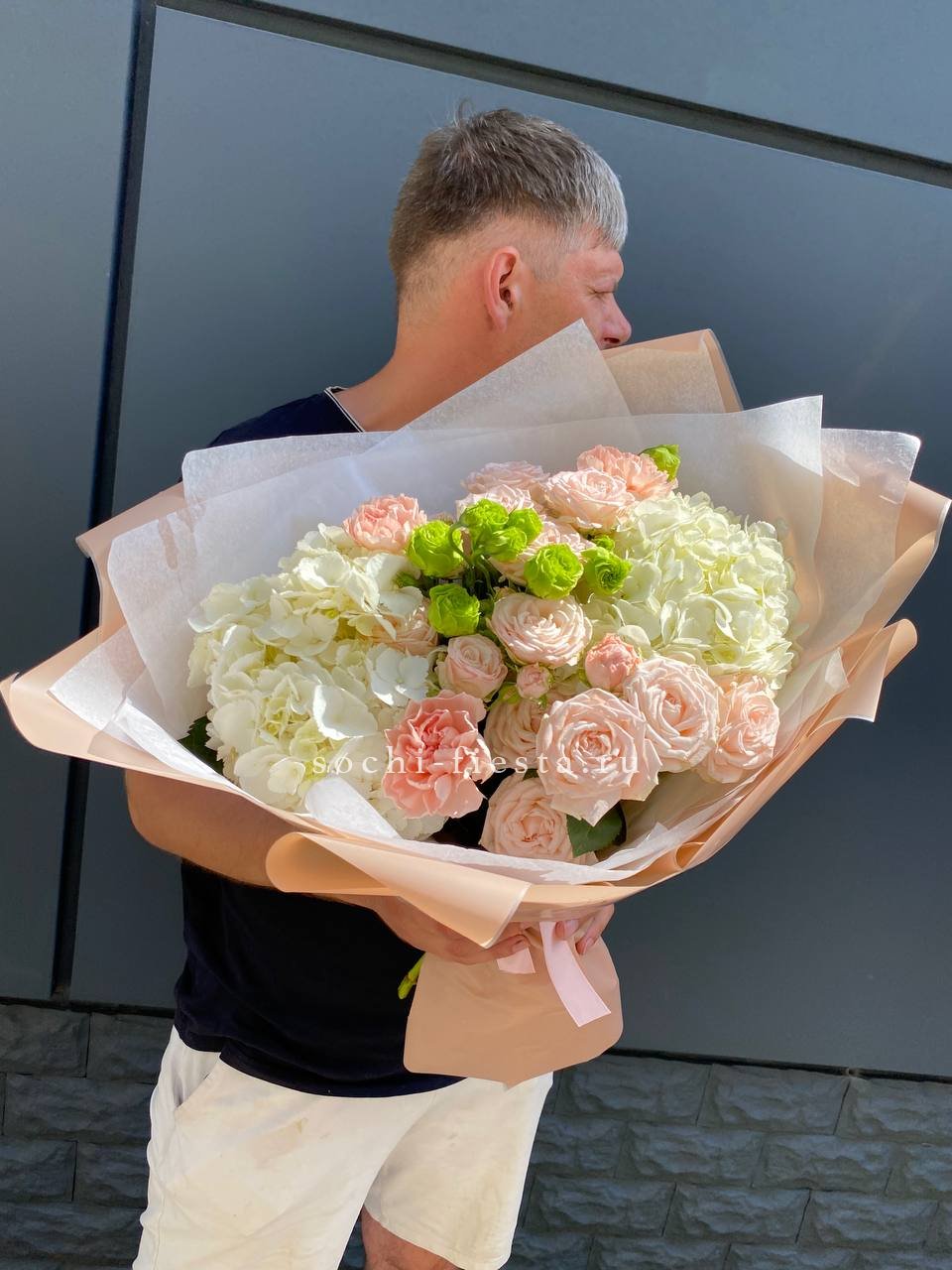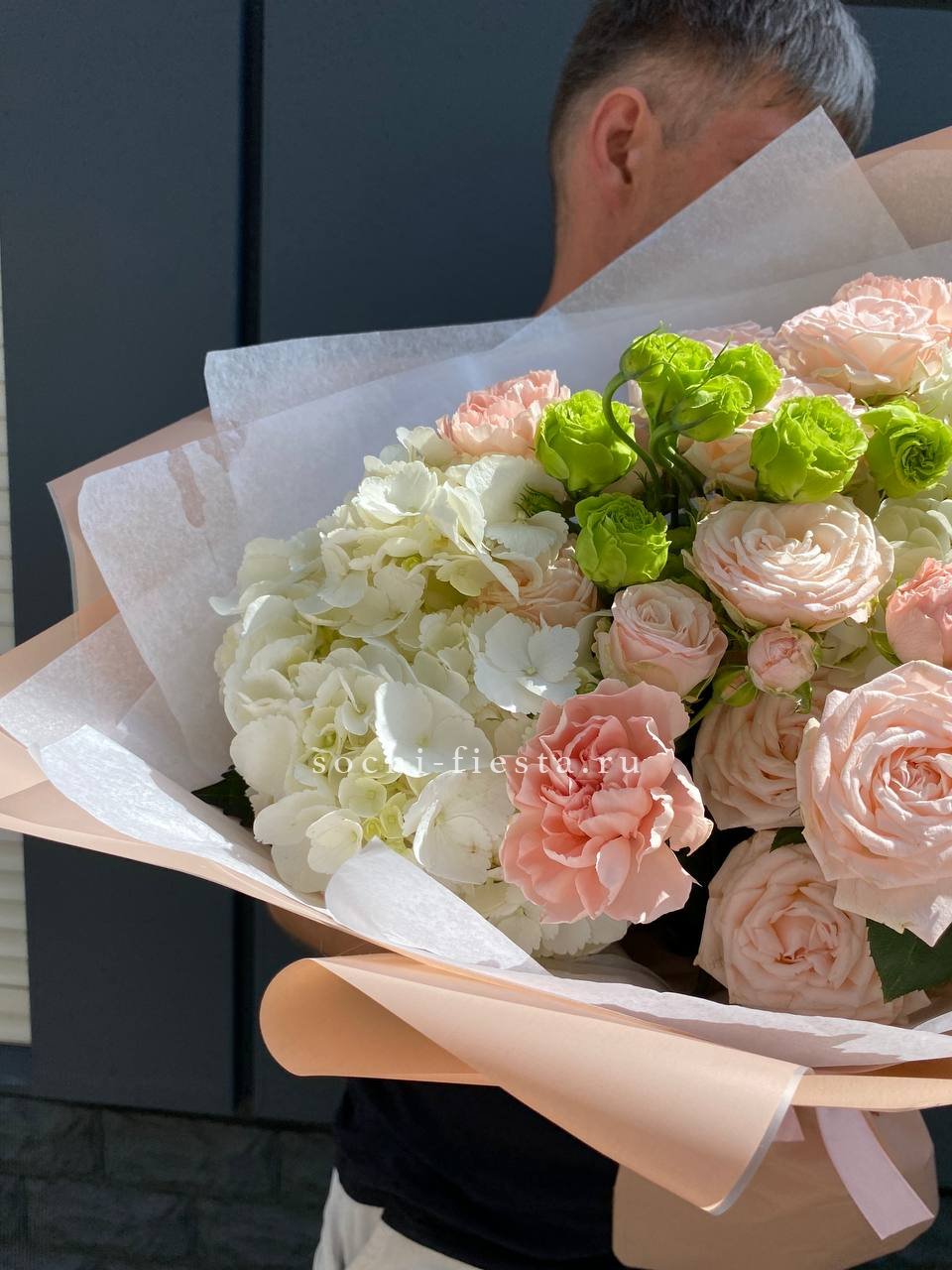 лилии, герберы, озатамус, белые розы в оформлении.