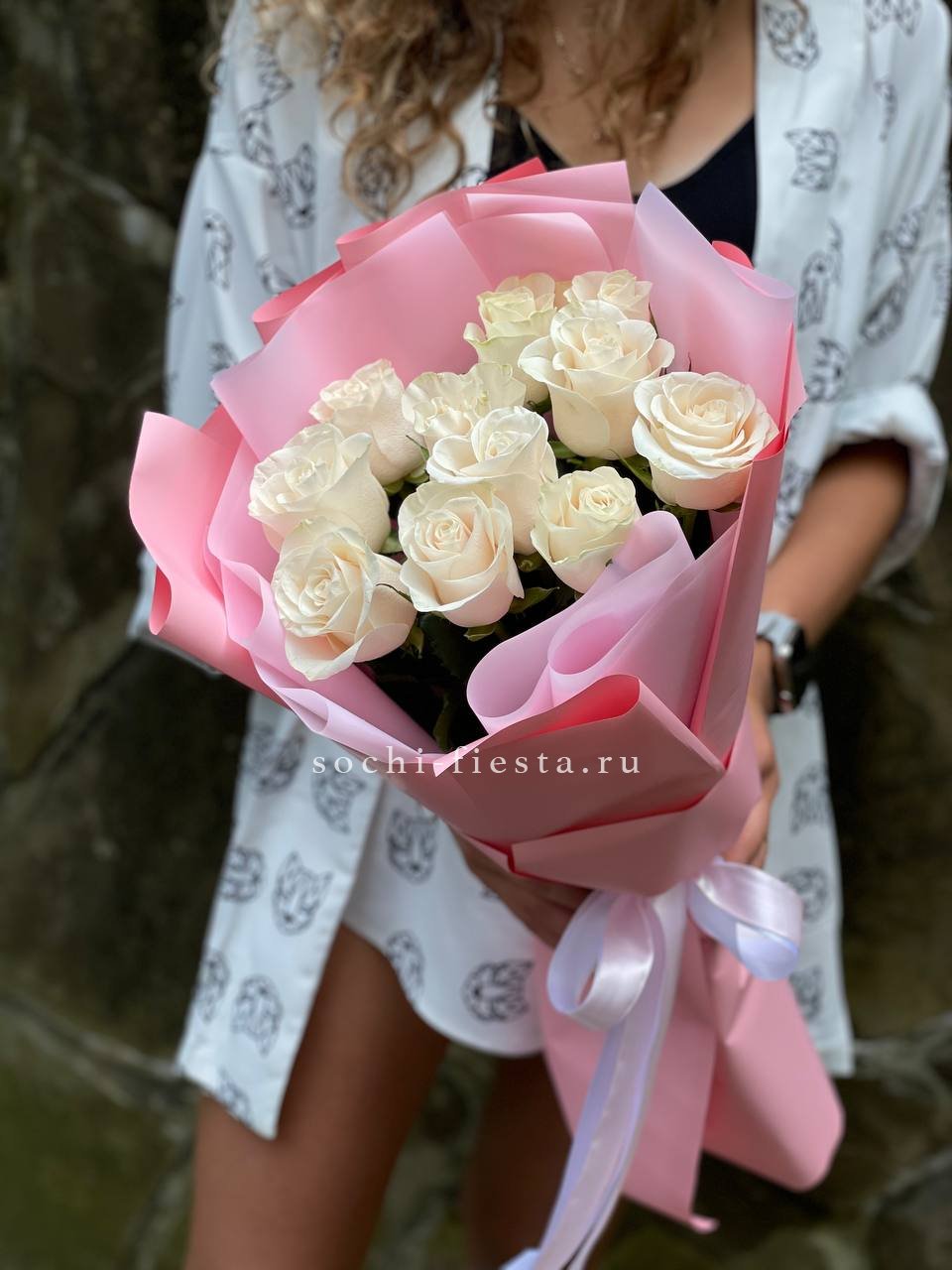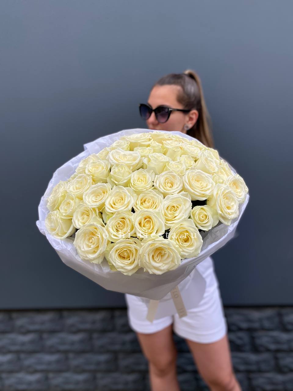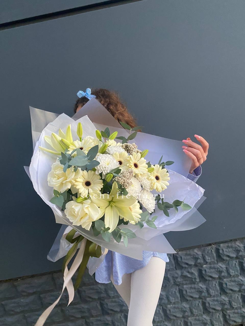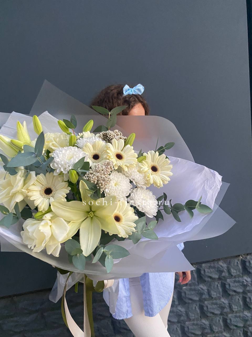 Яркие герберы и белоснежные лилии создают жизнерадостную композицию с чистым силуэтом. Озотамнус добавляет воздушности, а розы завершают образ свежестью и лёгкостью.
