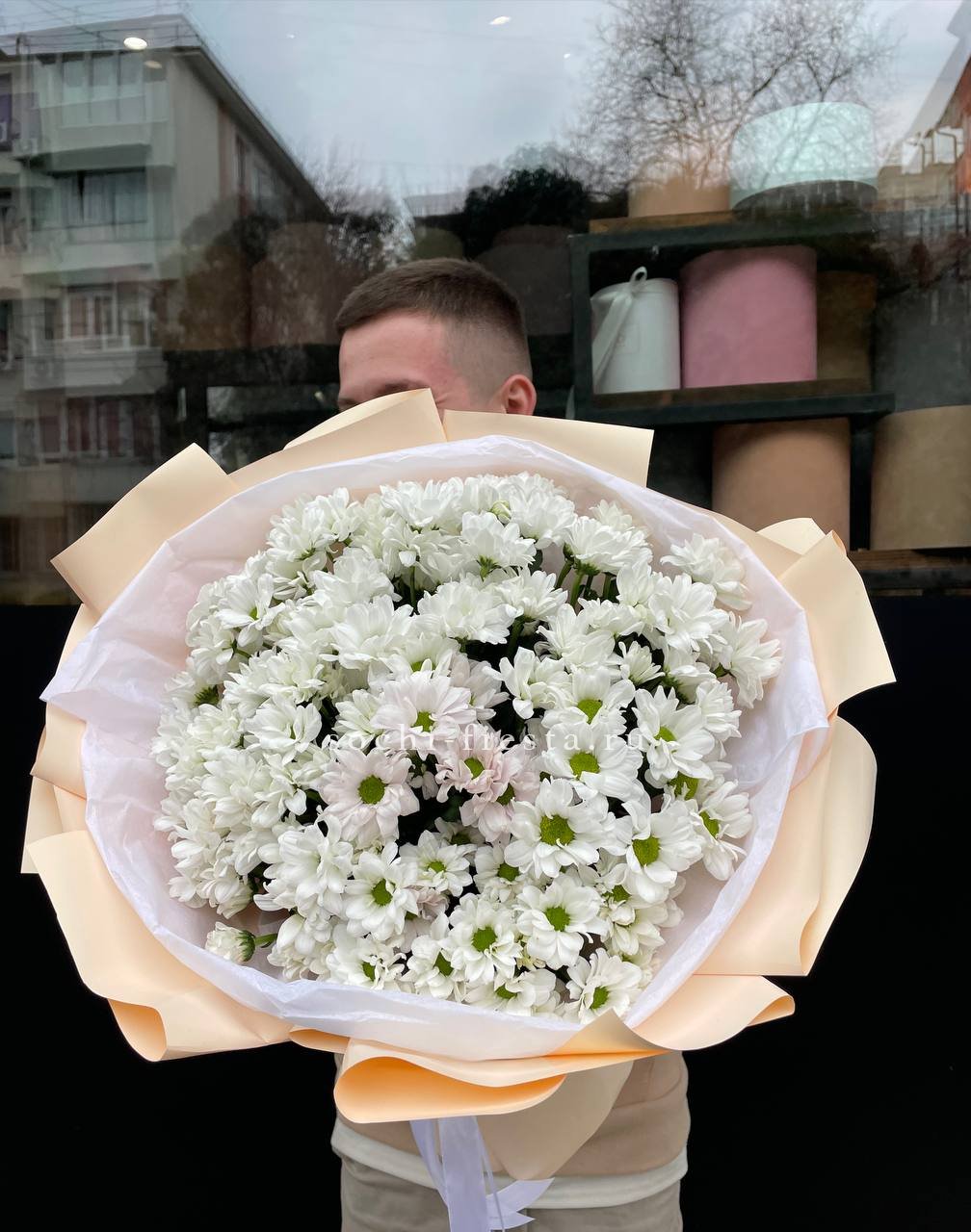 Fifteen веток кустовой хризантемы образуют пышное облако из множества мелких бутонов. Простая упаковка не отвлекает от густоты соцветий и их природной фактуры. Букет долго сохраняет свежесть и объём.