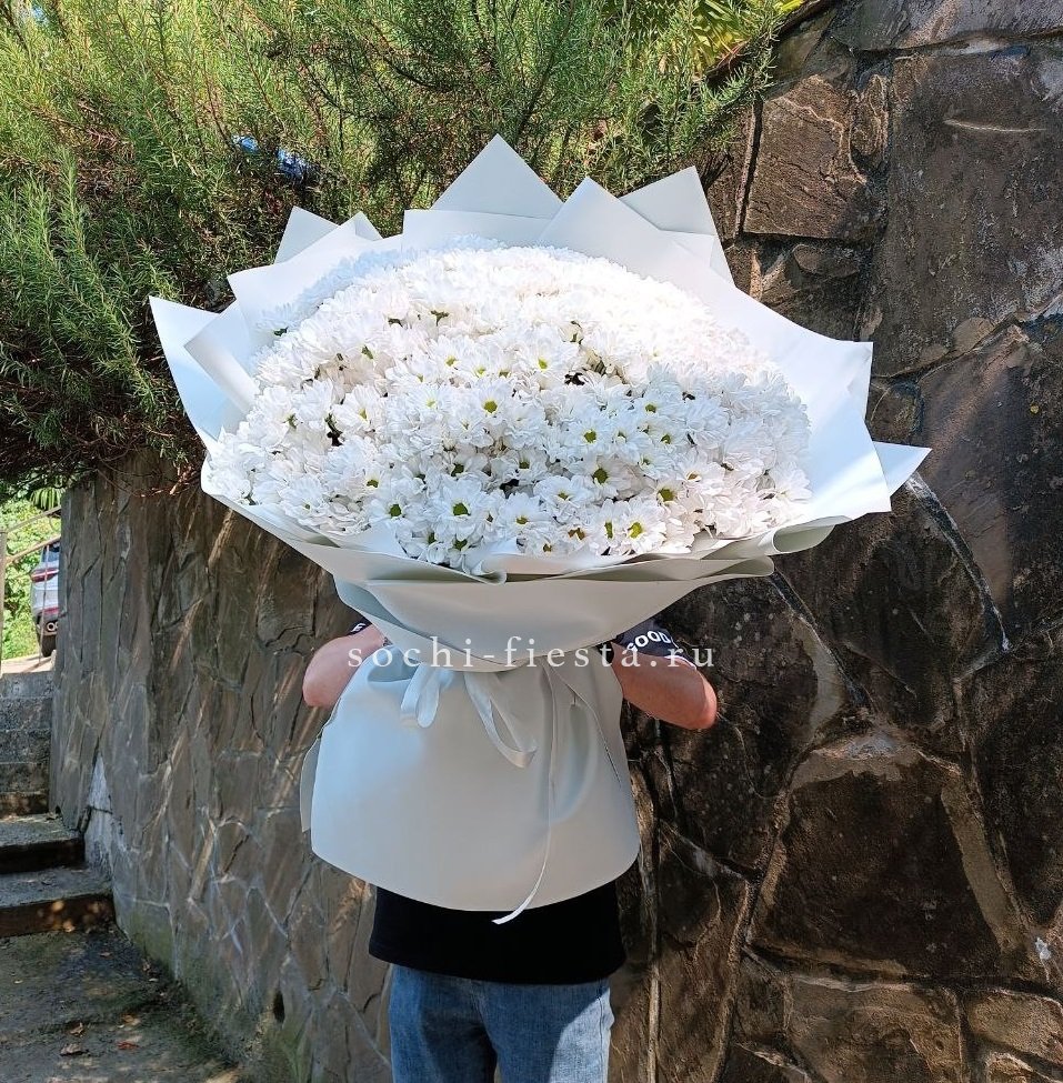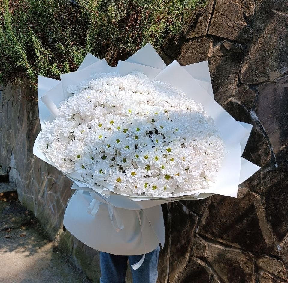 Пять веток кустовой хризантемы с множеством соцветий создают пышную воздушную массу. Букет напоминает утренний сад, где каждая ветка живёт своим ритмом и дарит ощущение лёгкости.