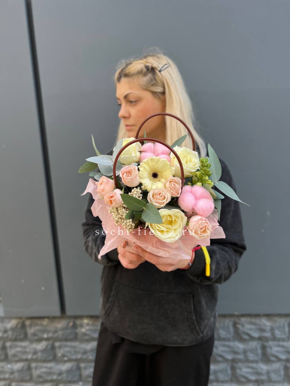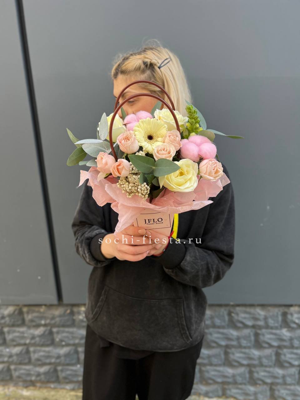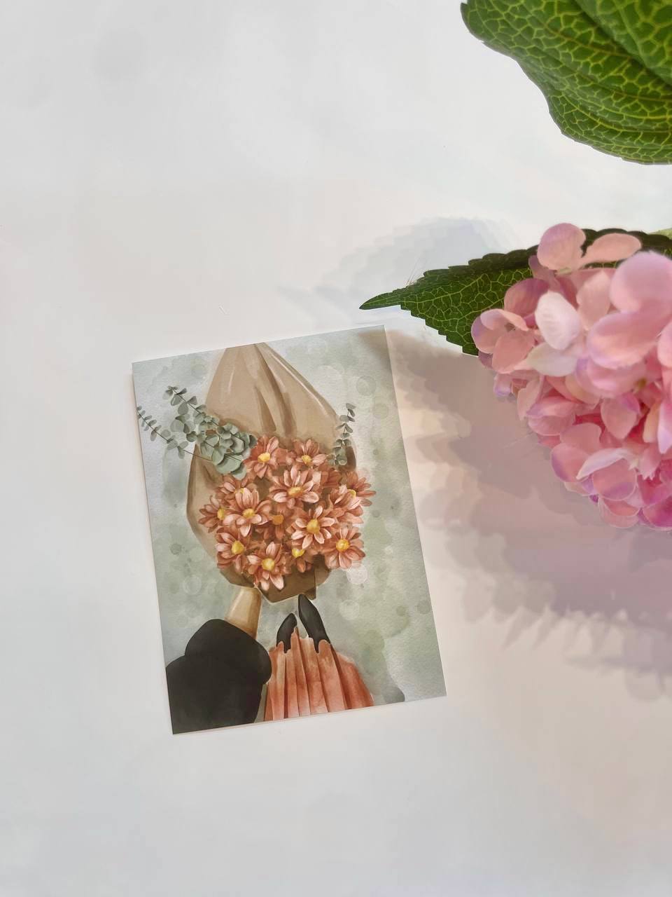 Лаконичная карточка с графичным слоганом добавляет букету характер. Минималистичный формат и чёткая типографика создают современный акцент. Для тех, кто говорит по делу.