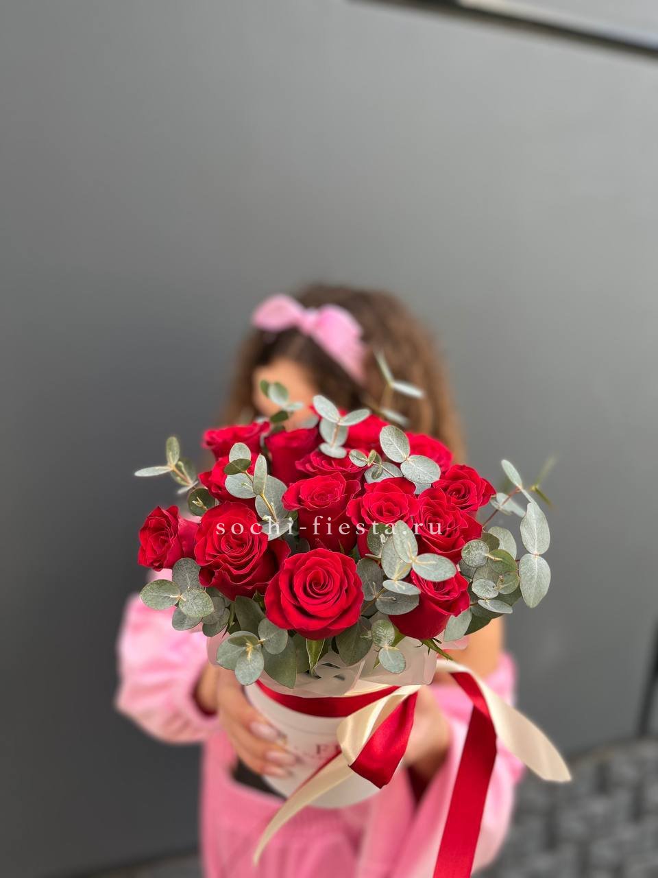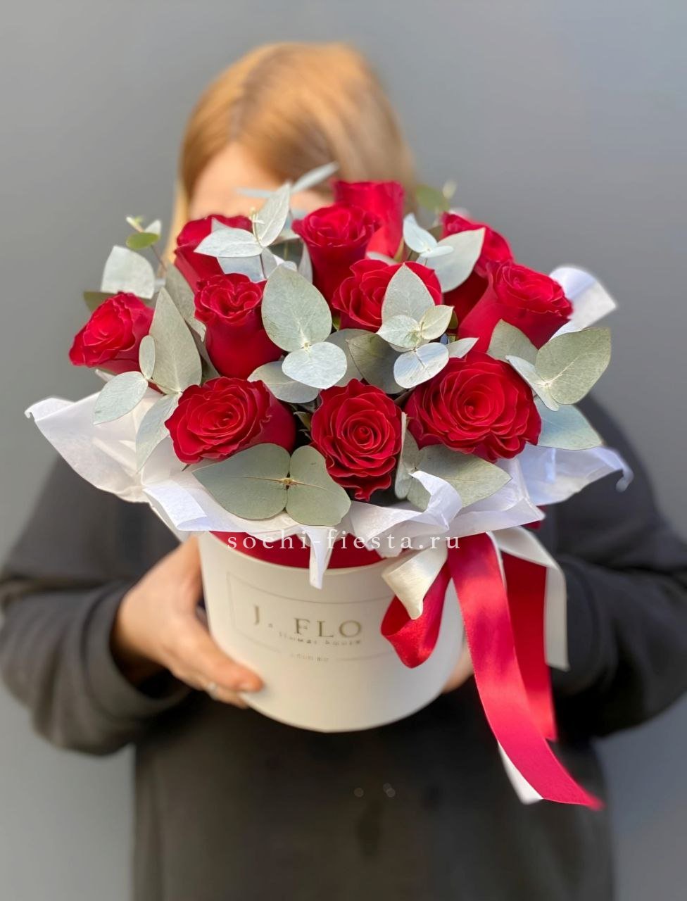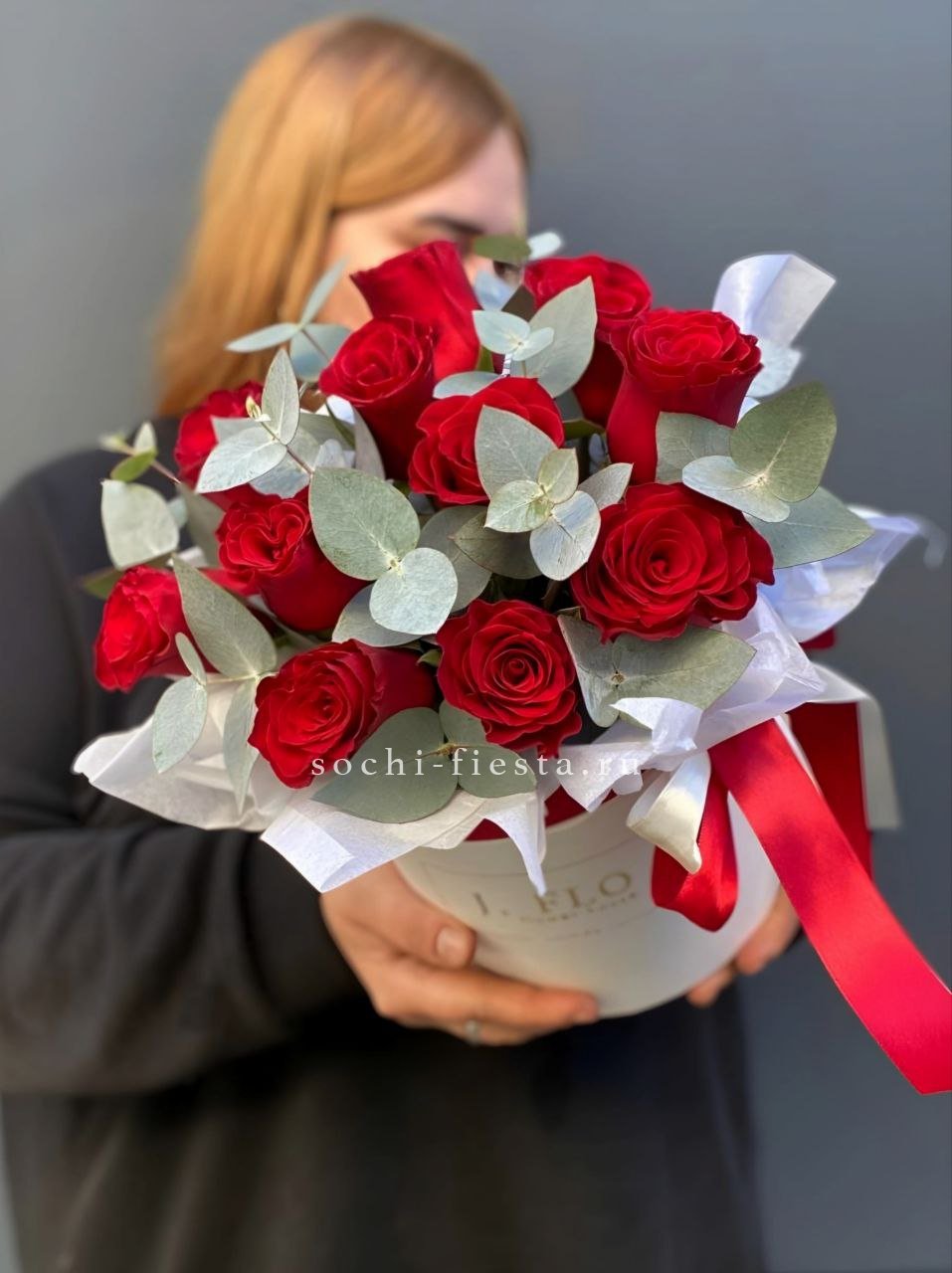 вывернутые белые розы , цилиндр D20, эвкалипт, лента, упаковка.