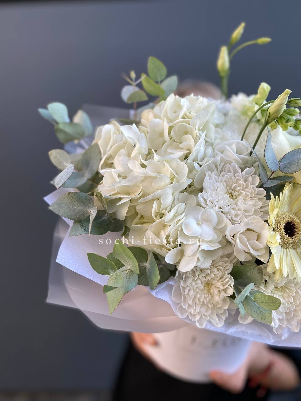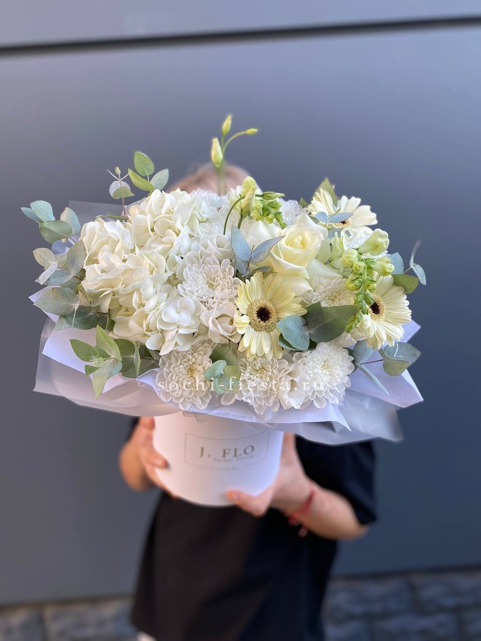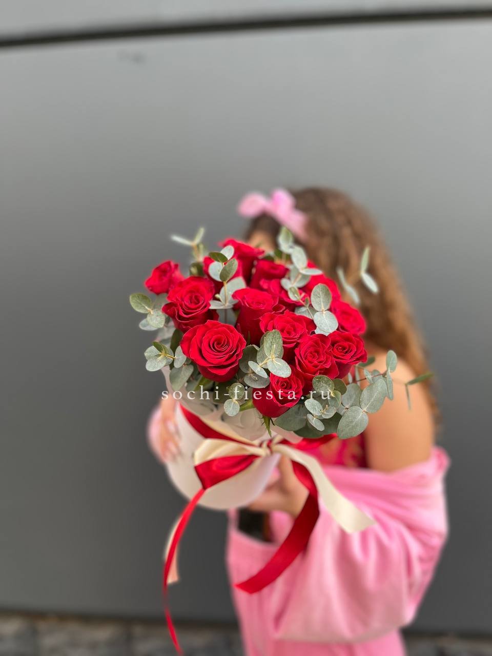 вывернутые белые розы , цилиндр D20, эвкалипт, лента, упаковка.