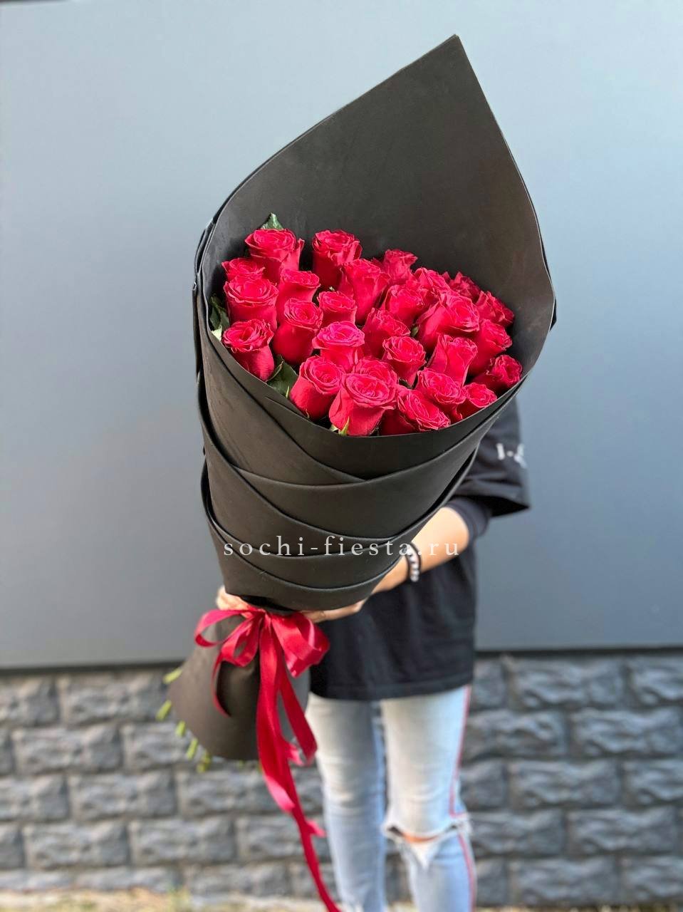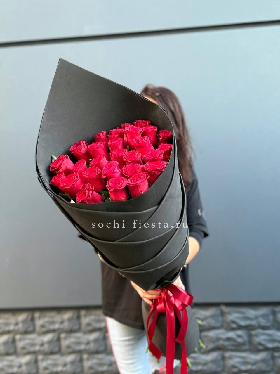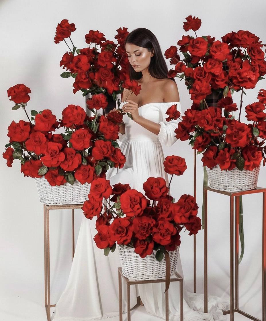Двадцать пять вывернутых французских роз наполняют белый цилиндр графичной структурой. Бутоны раскрыты плотно, лепестки образуют многослойную текстуру с мягкими изгибами и глубиной.