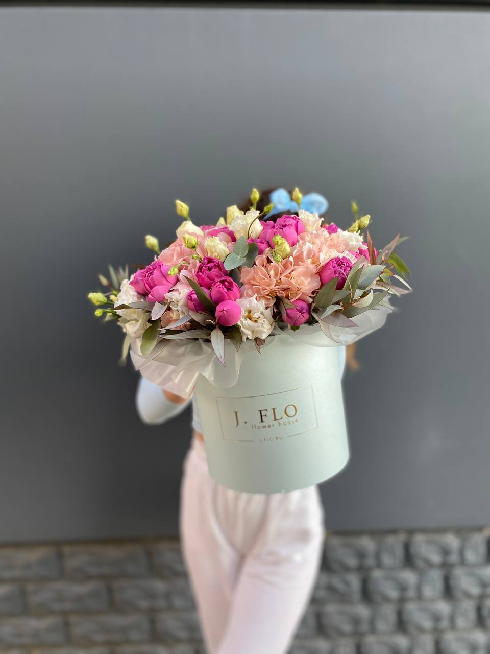 Пионовидные розы раскрываются пышными шапками среди воздушной гортензии и эустомы. Композиция собрана в круглом боксе и держит форму без дополнительной упаковки.