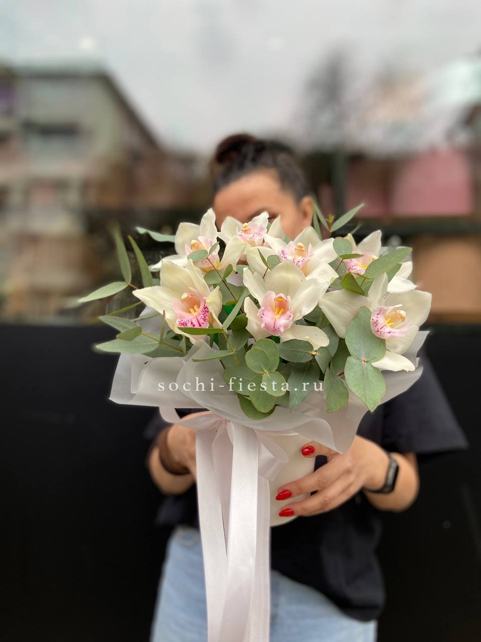 композиция выполнена из нежных роз, эустомы и диантуса с элементами перьев.