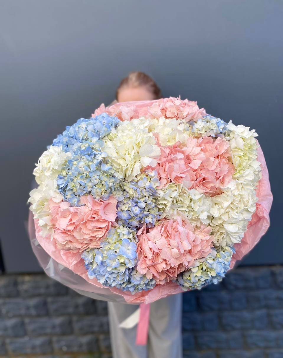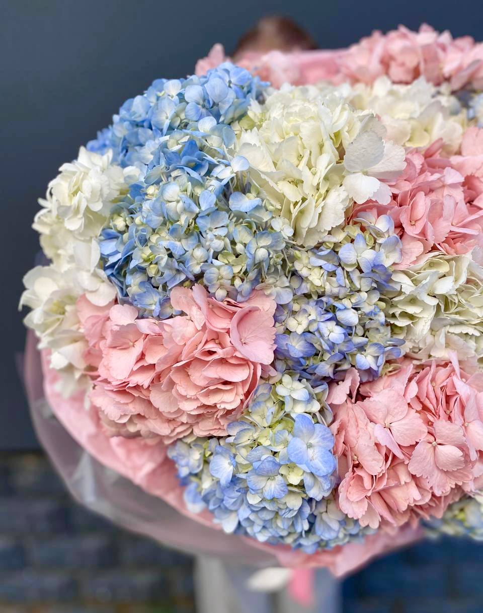 Сиреневая гамма раскрывается слоями от светлых до насыщенных тонов. Композиция заполняет пространство мягким цветом и создаёт воздушное впечатление в просторной коробке.