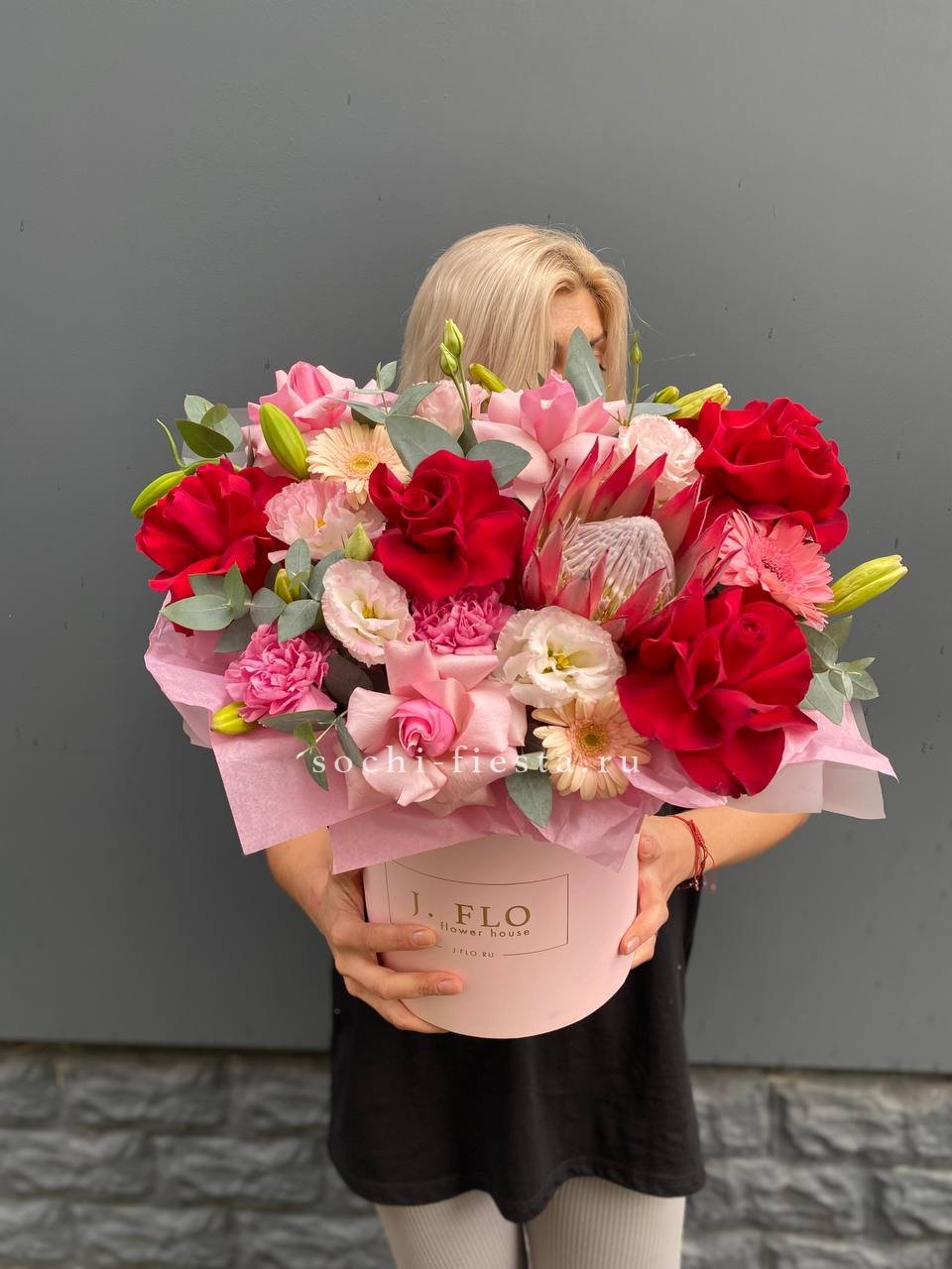 Плотная сборка из двадцати одной красной розы заполняет всё пространство цилиндра насыщенным бордовым оттенком. Зелень обрамляет композицию по краю и создает четкую графичную линию.