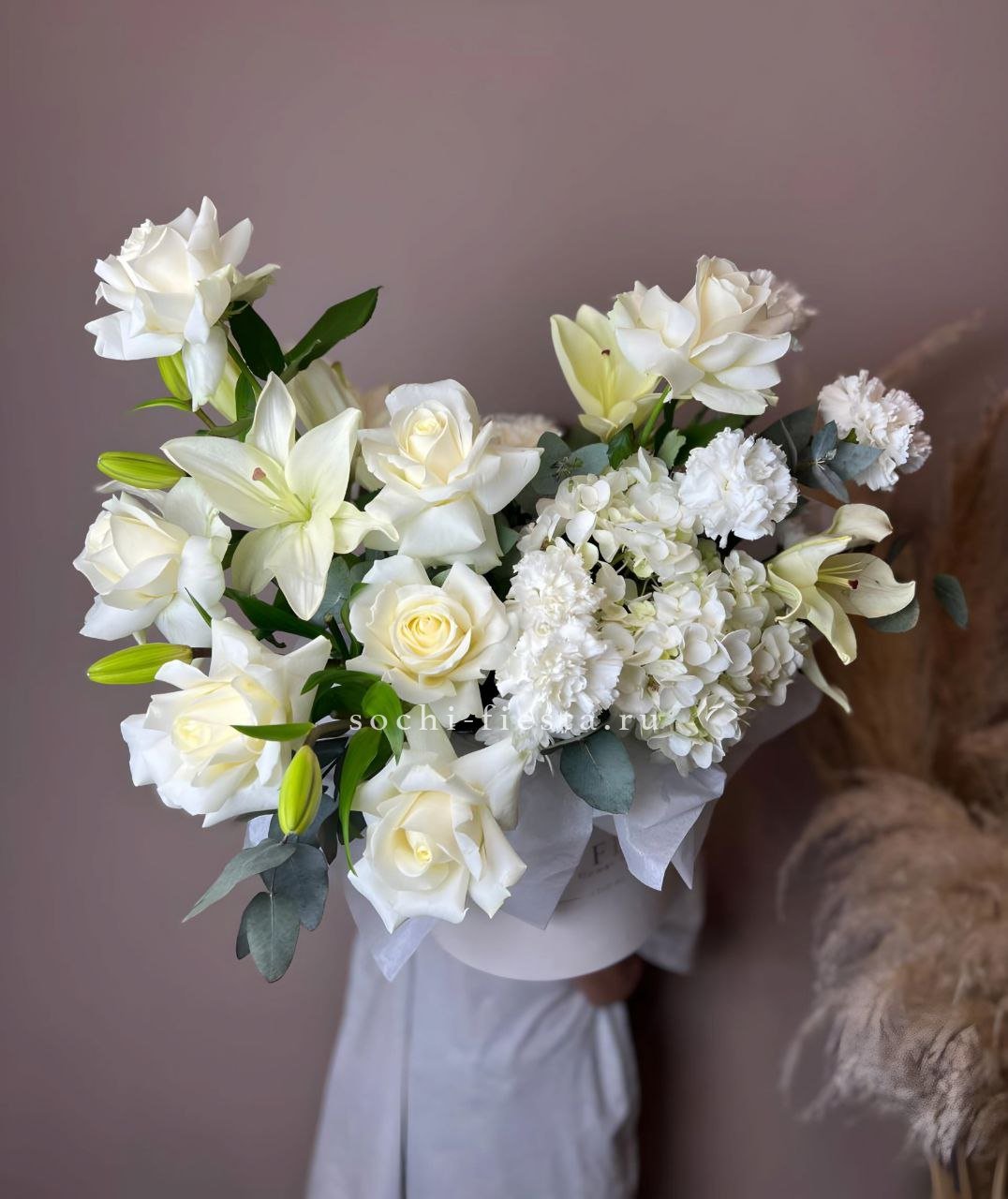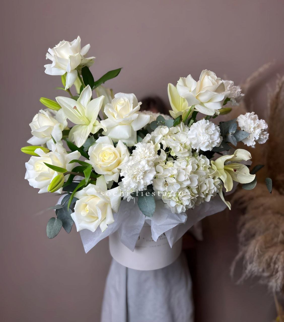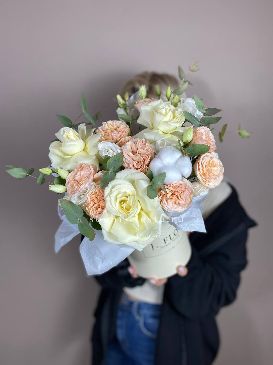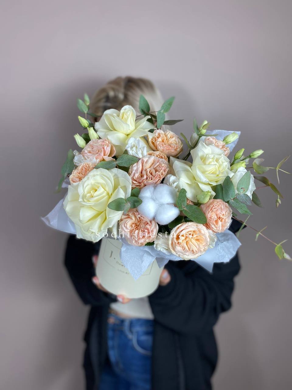 роза, диантус, пионы или гортензия, розы, бомбастик, эустома, декоративная зелень, цилиндр D16.