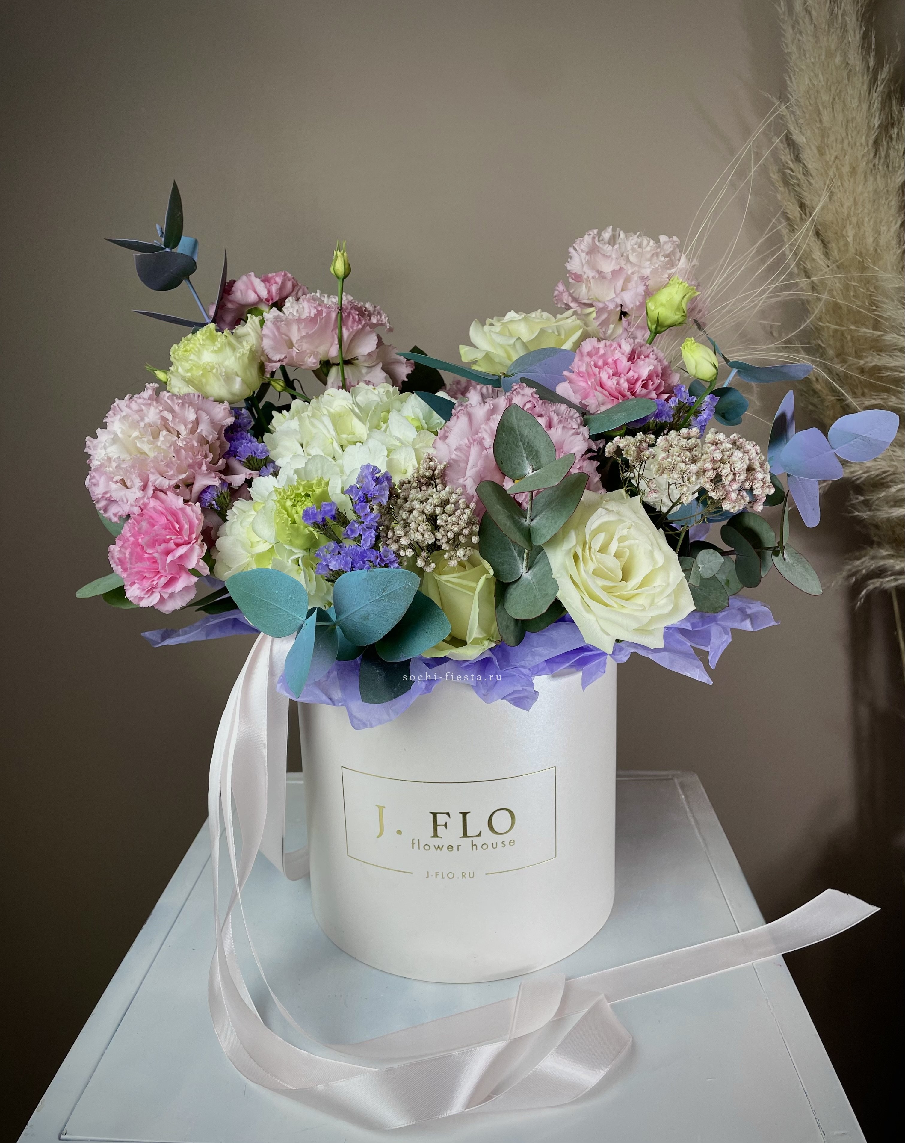 гортензия, пионовидные розы, эустома, эвкалипт, бокс 16.