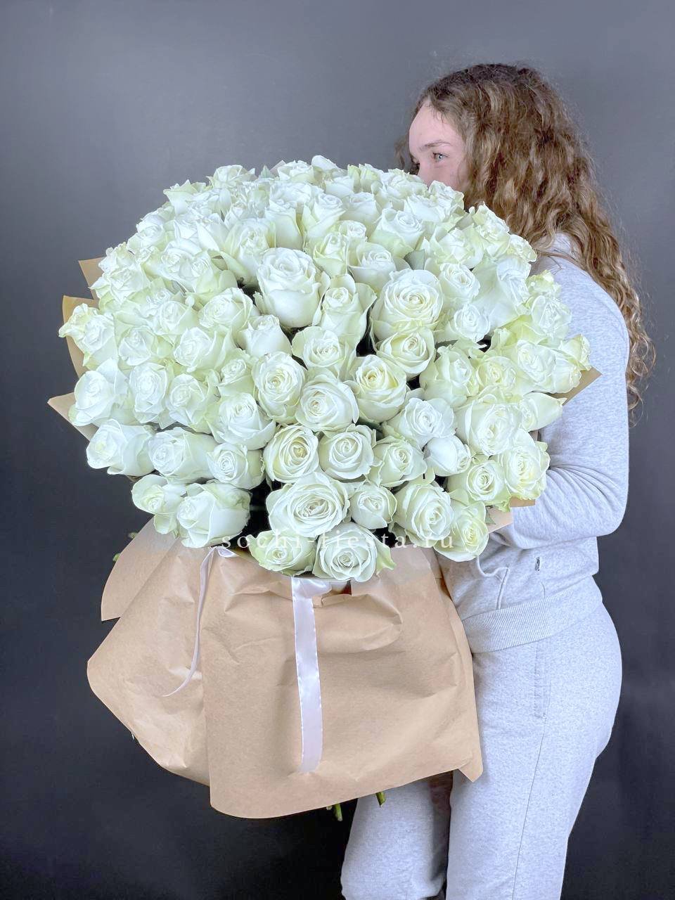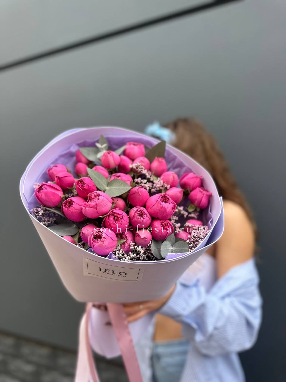 Пионовидные розы Мисти Бабблс с пышными многослойными бутонами создают объемную текстуру. Воздушная стифа и эвкалипт добавляют композиции легкости.