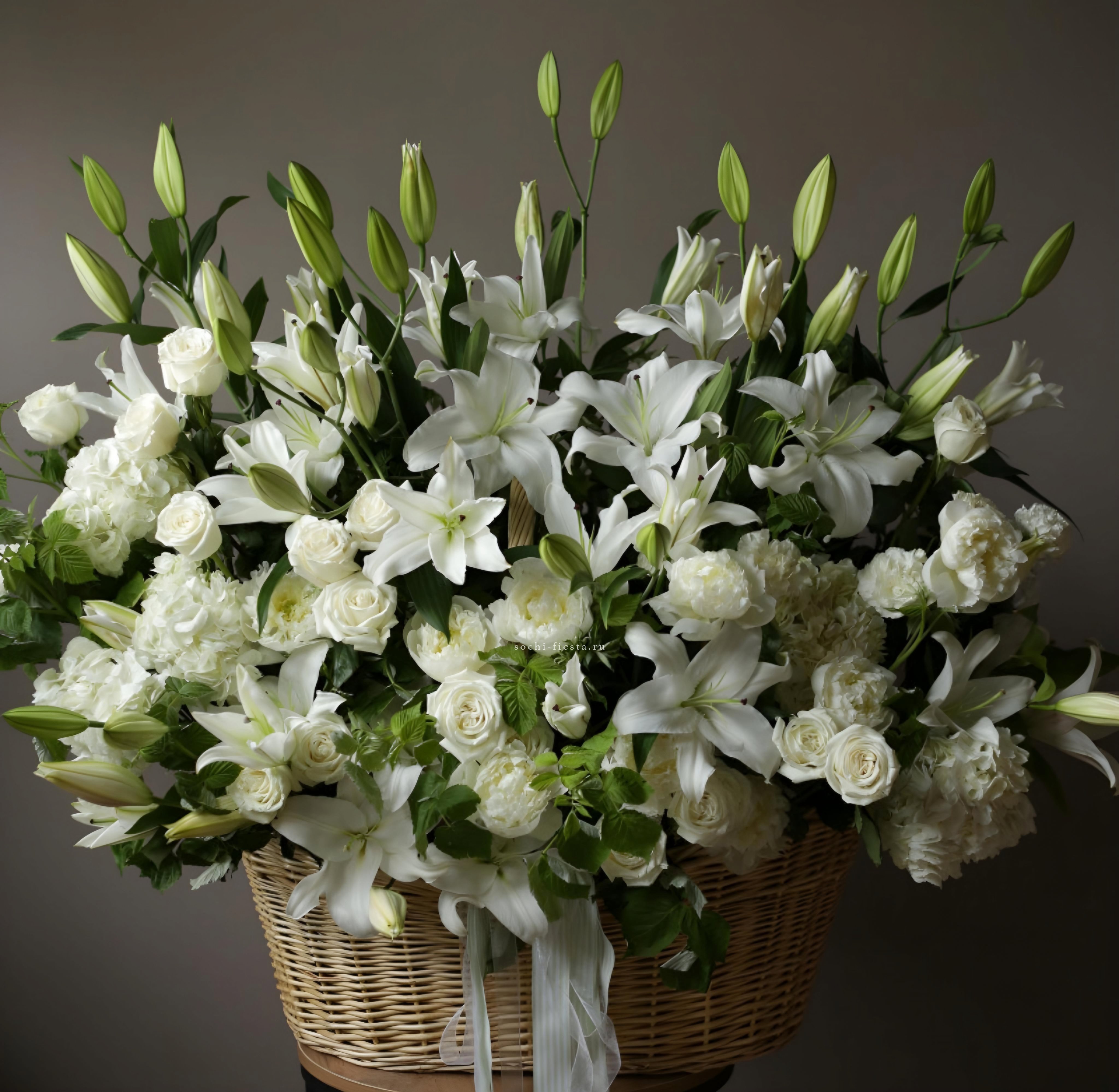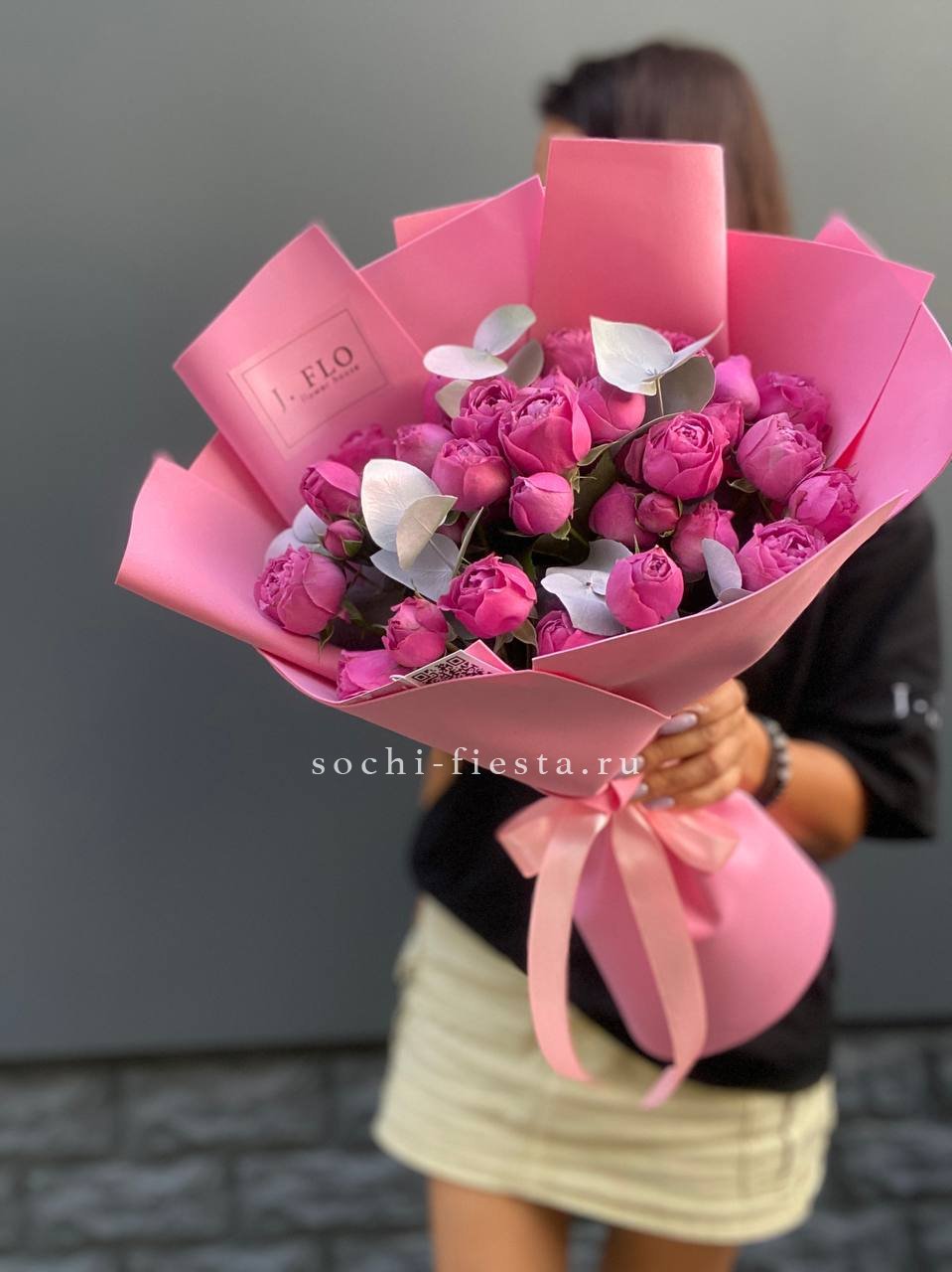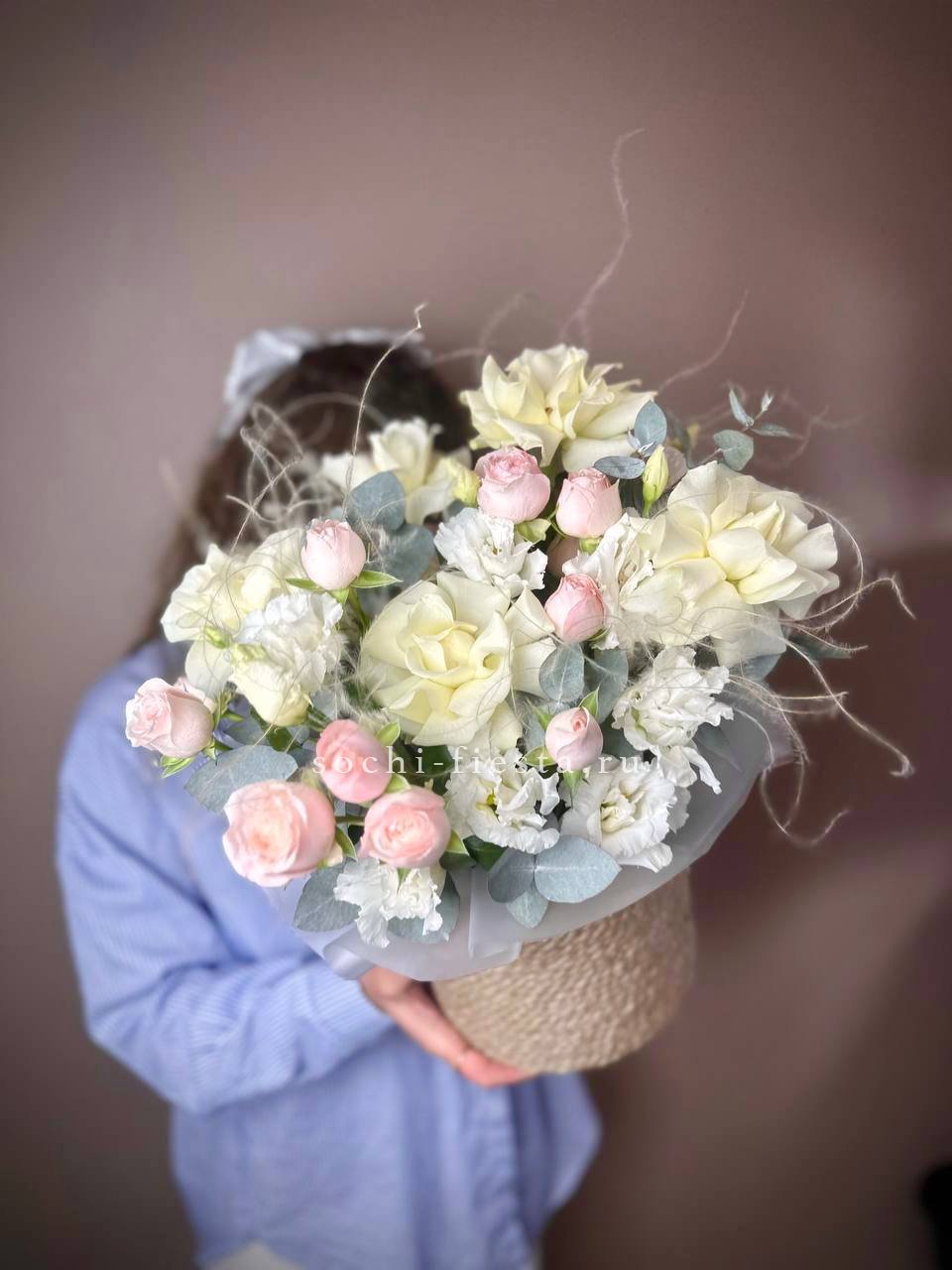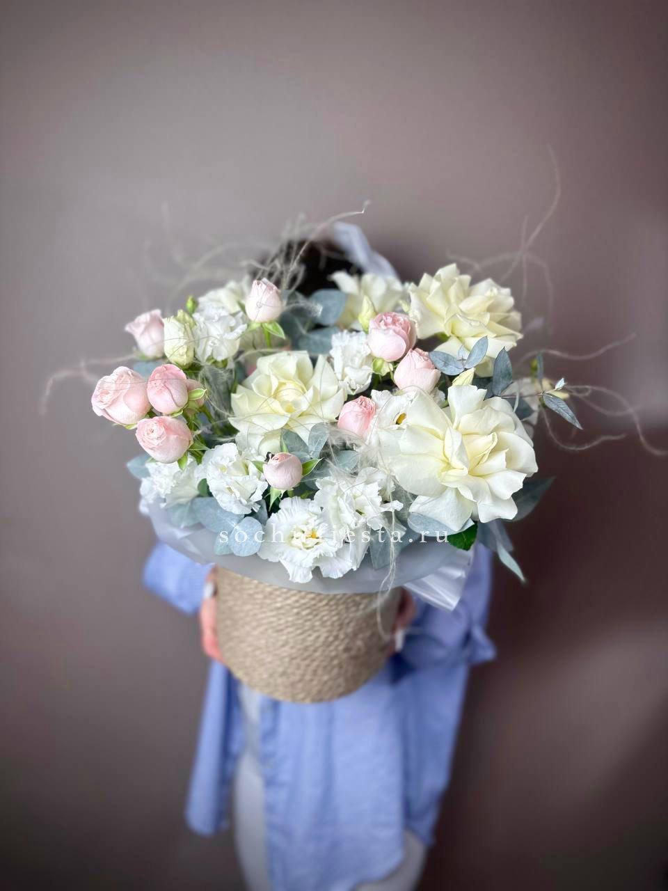 Плотные бутоны сорта Мисти Бабблс полностью раскрыты и образуют пышную шапку над природным джутовым основанием. Лепестки создают многослойную текстуру с мягкими переходами оттенков. Эвкалипт и стифа добавляют воздушности по краям композиции.