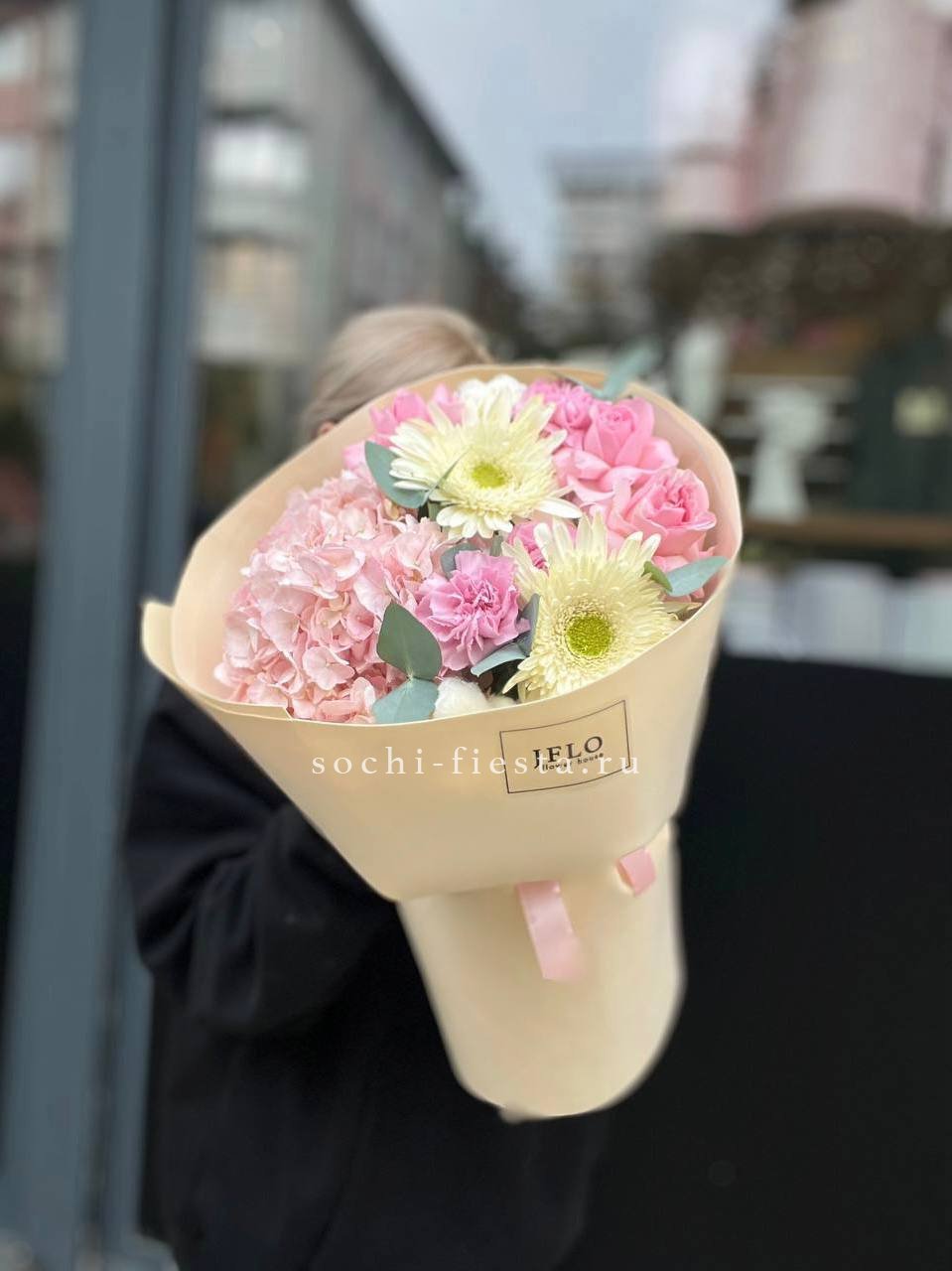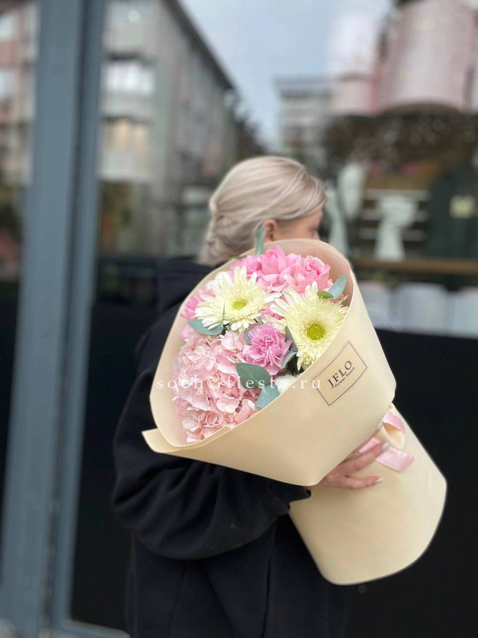 Розовые розы встречаются с орхидеей цимбидиум в объемной сумке-кашпо. Эустома и диантус создают многослойность, а кустовые розы заполняют пространство между крупными бутонами. Композиция держит форму и радует насыщенностью.