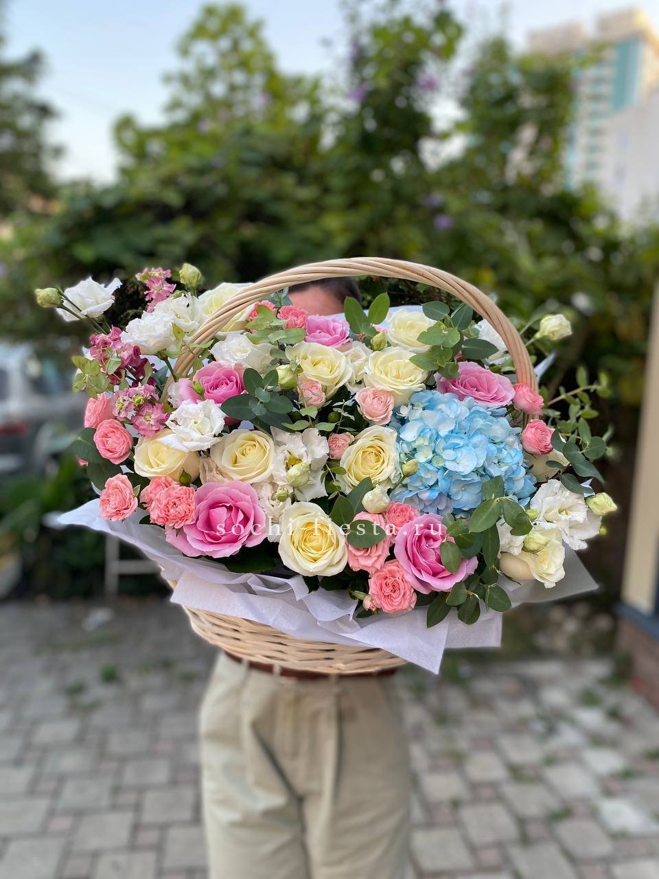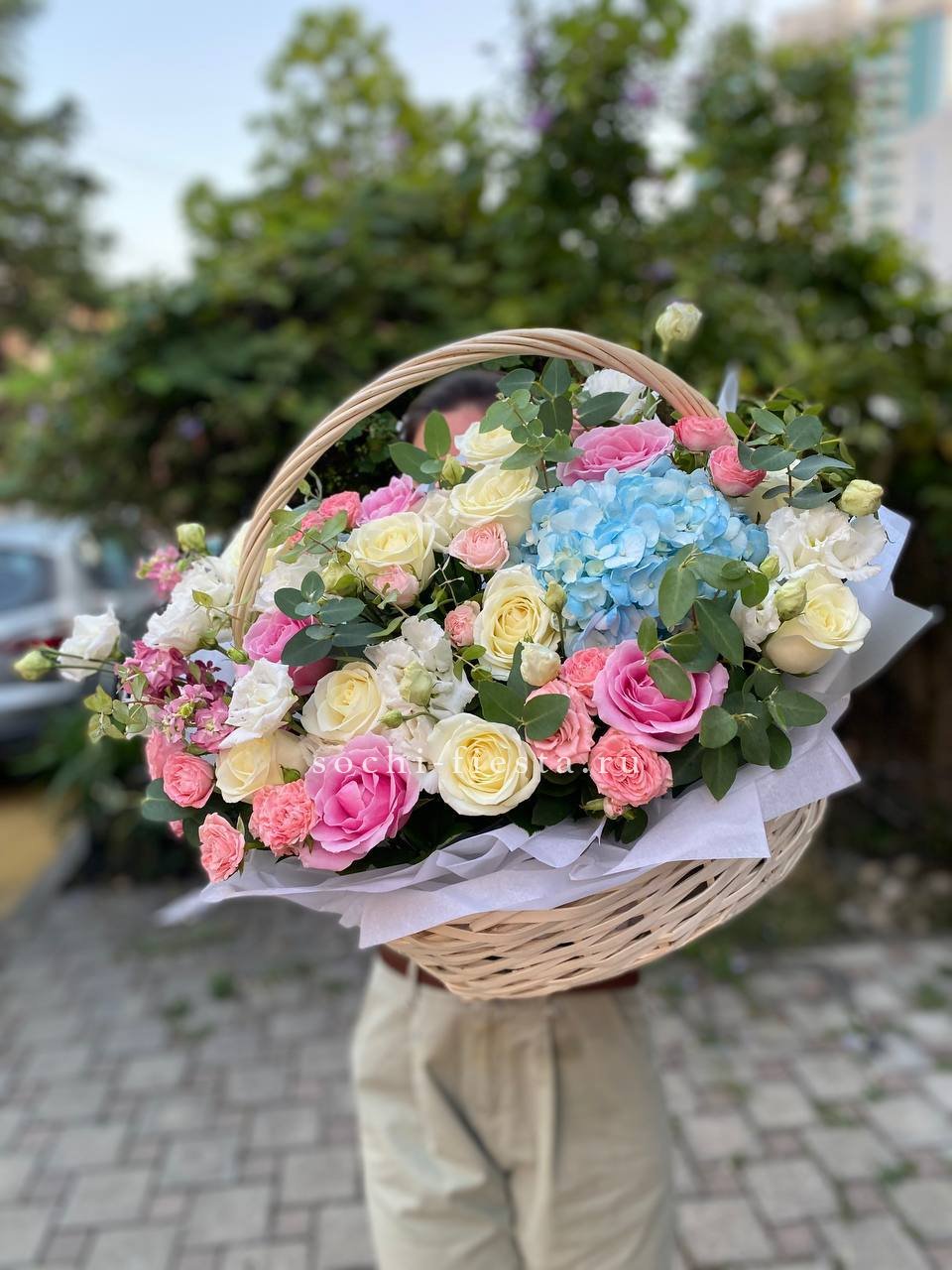 Плотная россыпь бутонов формирует округлую композицию с мягкими переходами оттенков. Розы и эустома создают объёмную текстуру, а пышные соцветия гортензии заполняют пространство между ними. Корзина удобна для размещения на столе или комоде.