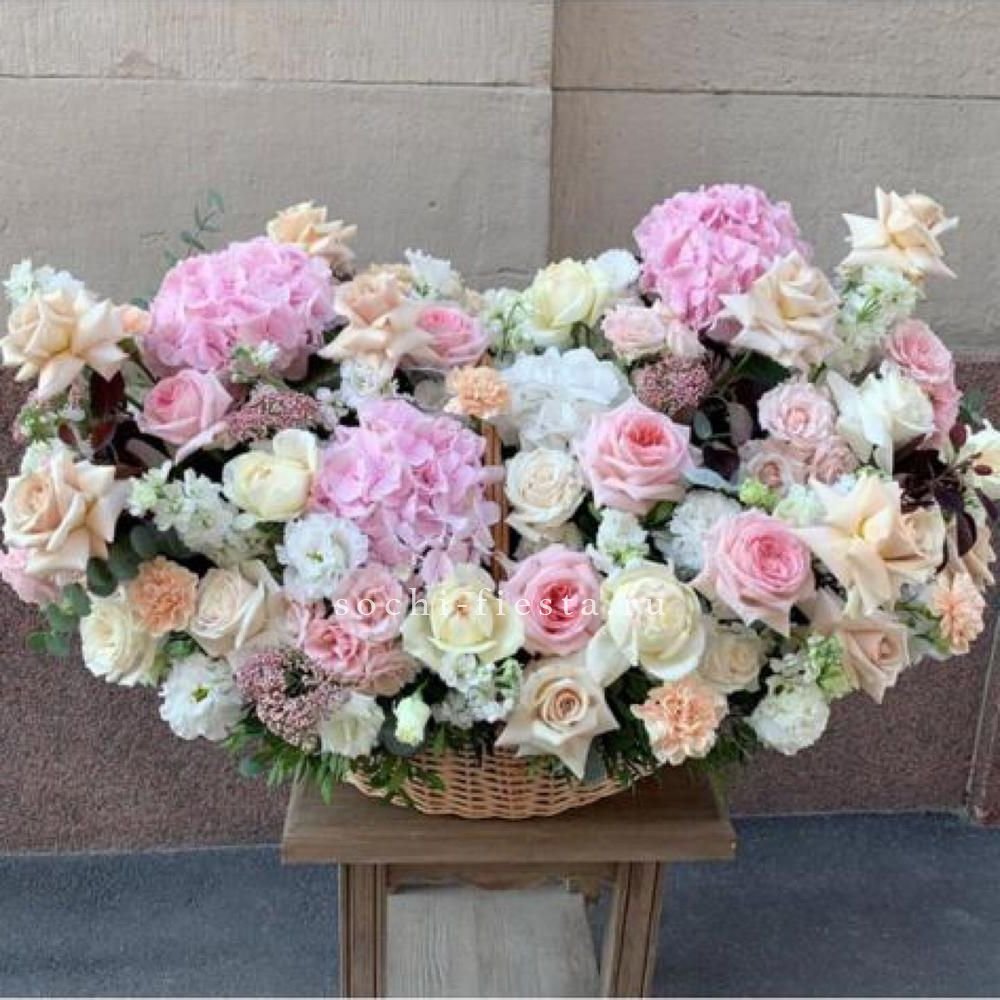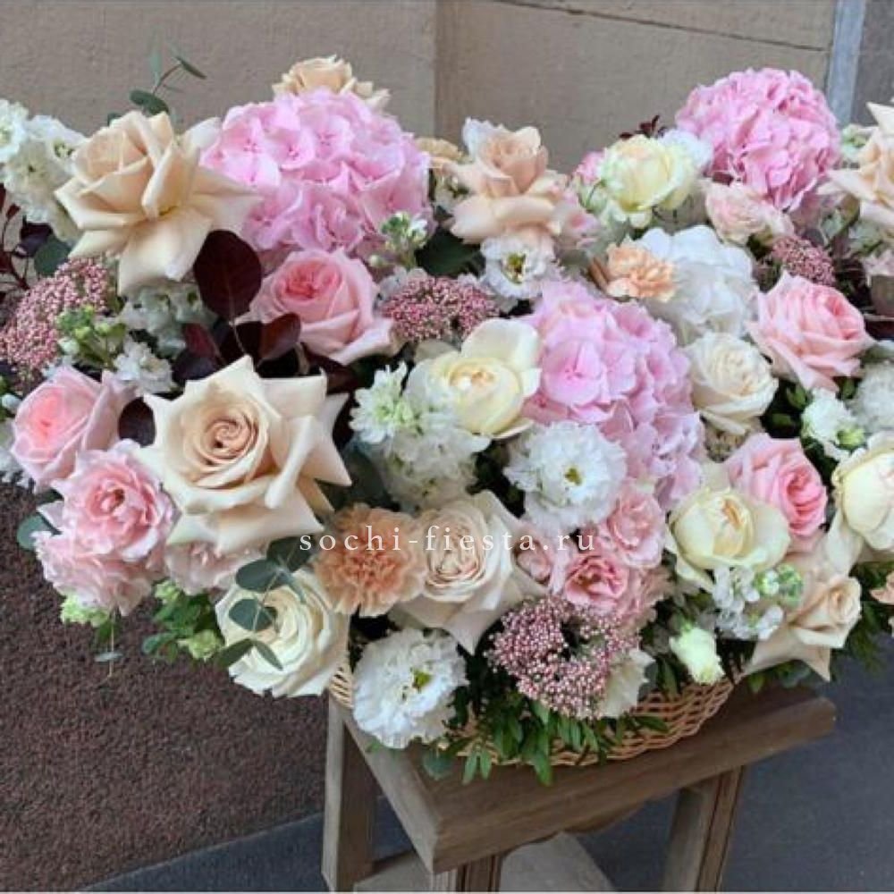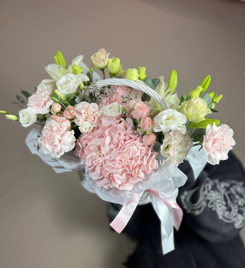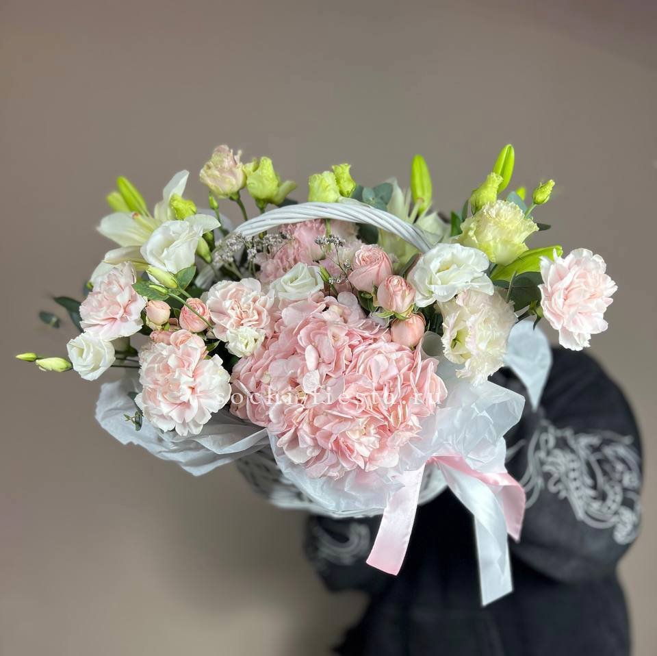 цветочная корзина с розами, мисти баблс, диантусами и гортензией.