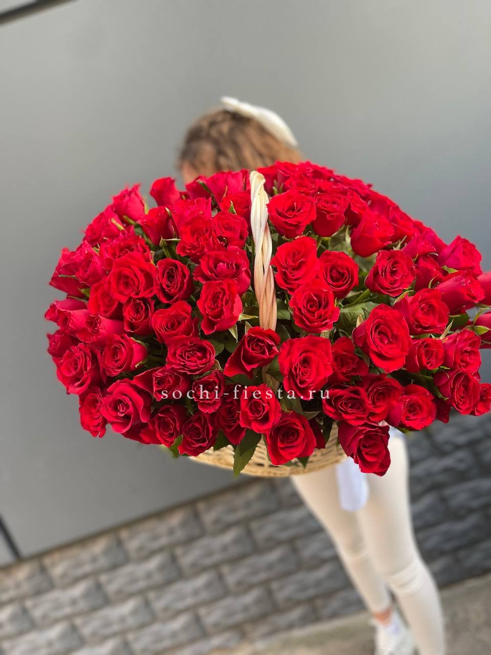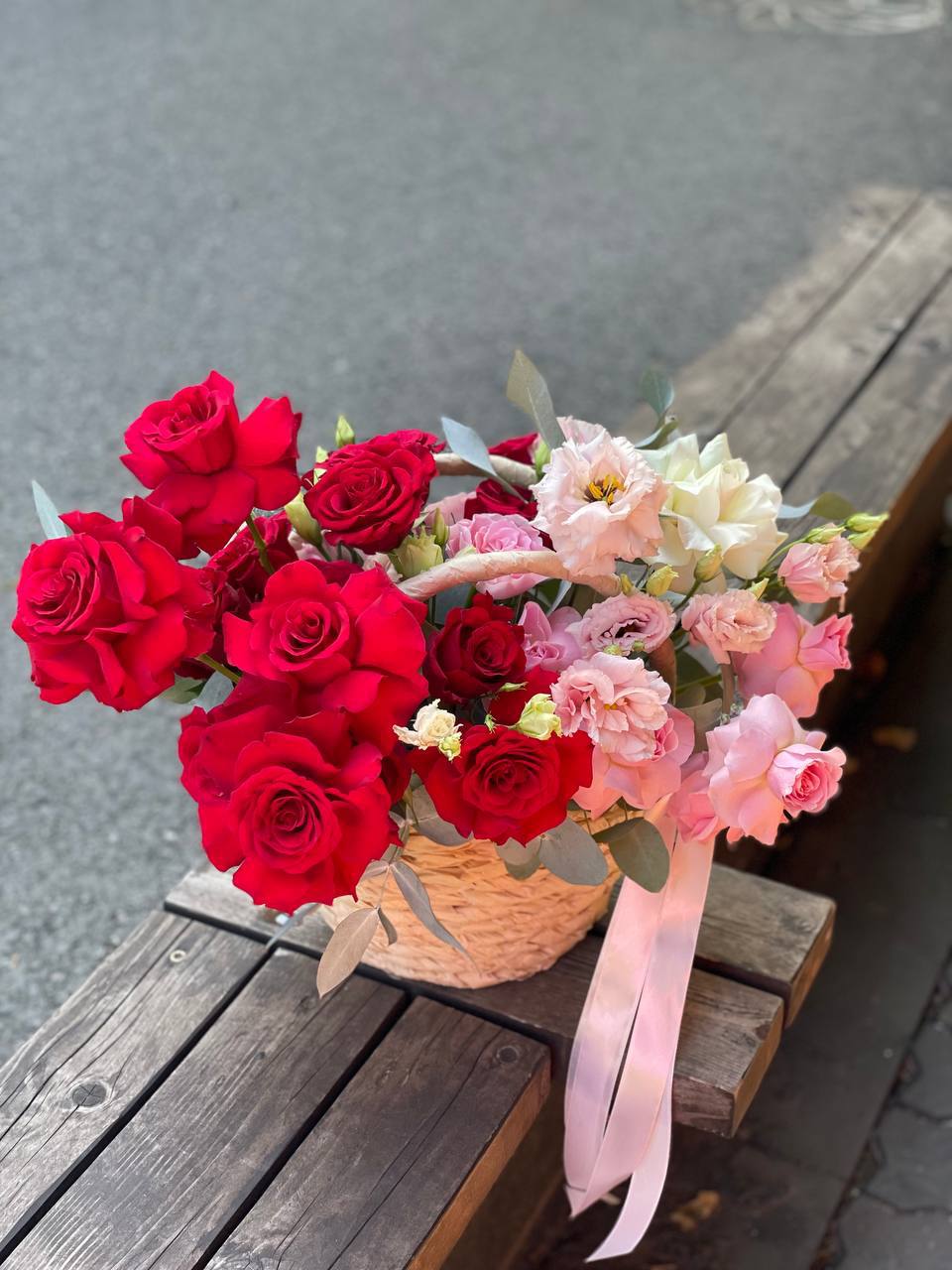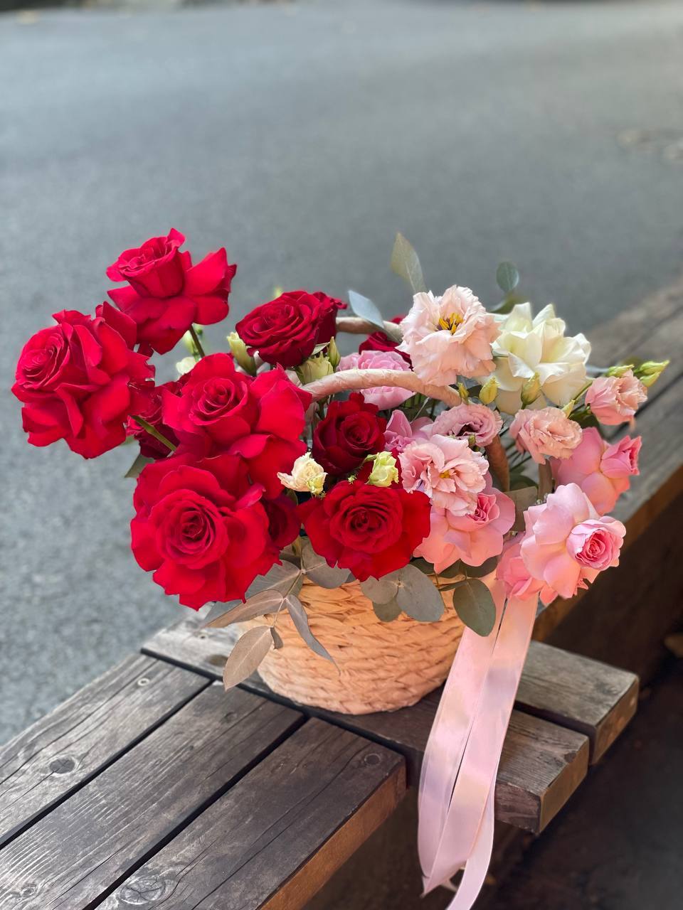 цветочная корзина с розами, мисти баблс, диантусами и гортензией.