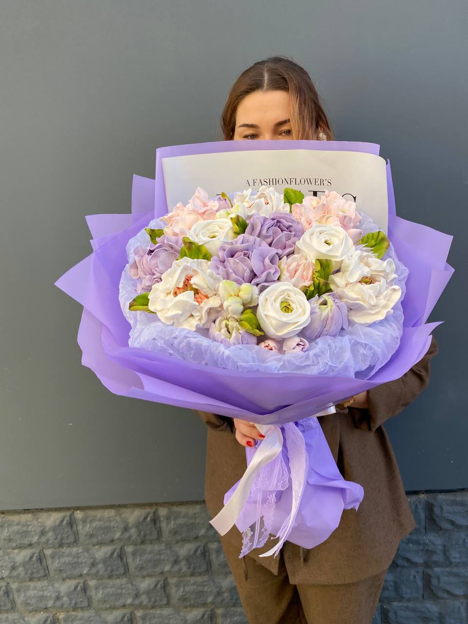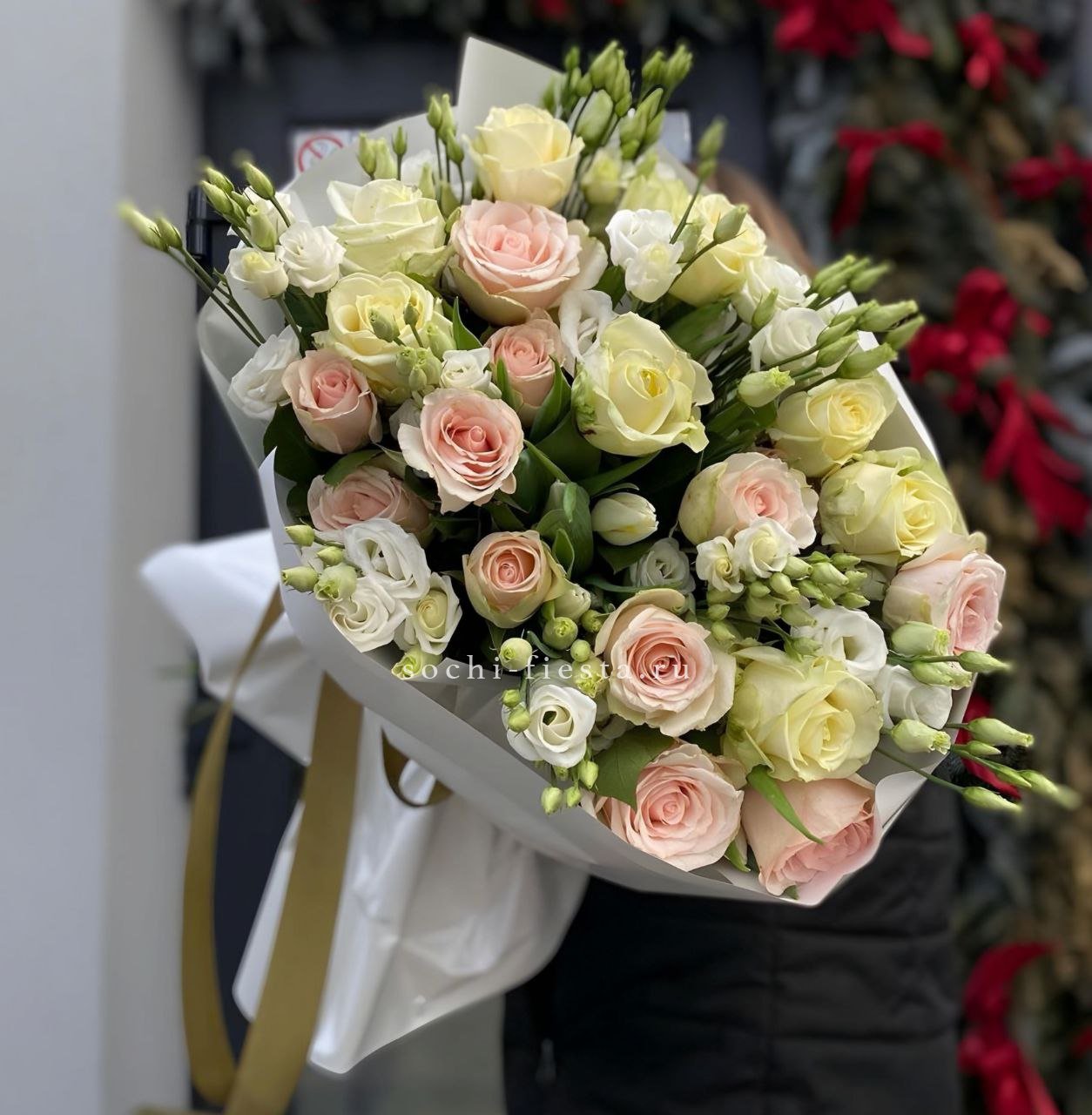 Эта роскошная интерьерная корзина — настоящее воплощение цветущего сада, наполненного нежностью и свежестью. Она выглядит невероятно объемной и фактурной благодаря гармоничному сочетанию классических и экзотических цветов.