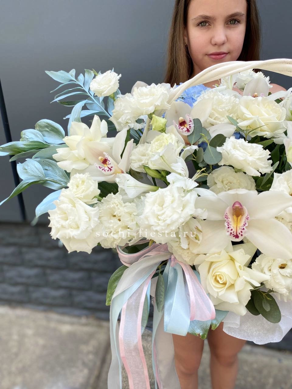 Корзина с орхидеями и гортензией раскрывается объёмной шапкой соцветий. Синие и белые оттенки перетекают друг в друга, создавая живописную композицию. Такое оформление удобно переносить и сразу размещать на столе.