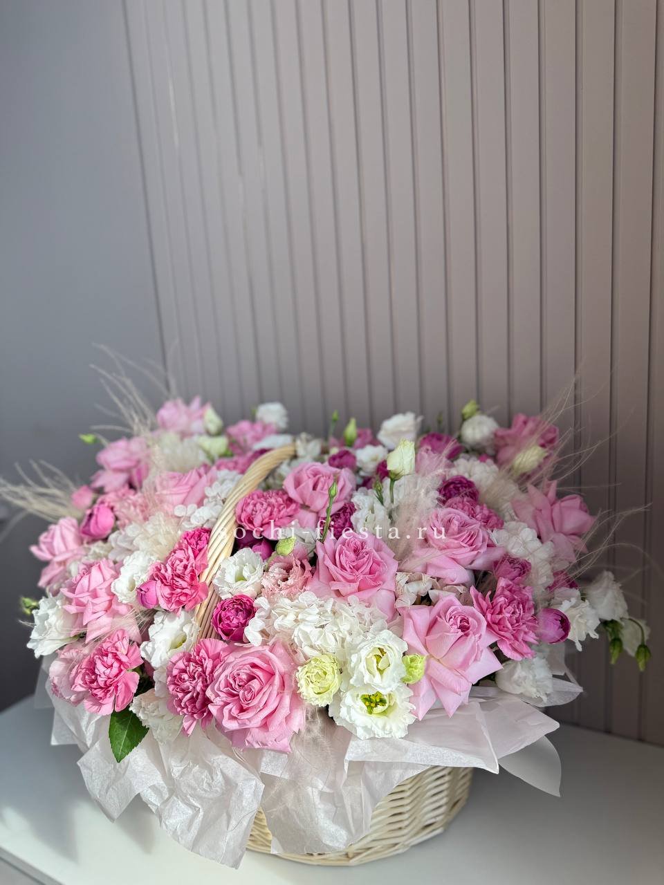 Корзина объединяет садовые розы с воздушной эустомой и яркими вспышками альстромерии. Ковыль добавляет лёгкости, а гортензия создаёт фактурный фон для всей композиции.