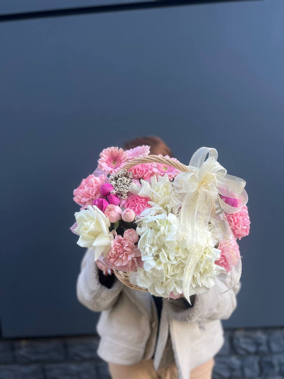 Здесь идеально сочетаются крупные, бархатистые бутоны роз, облака гортензии и мелкие акцентные цветы. Получилась невероятно воздушная и легкая композиция, которая мгновенно создает ощущение праздника и весеннего настроения. Стильный бант завершает этот изысканный образ.