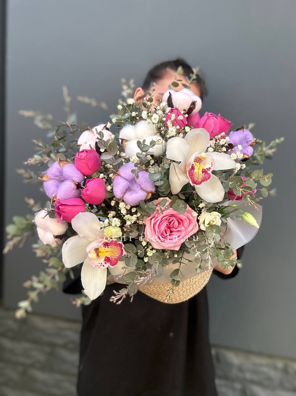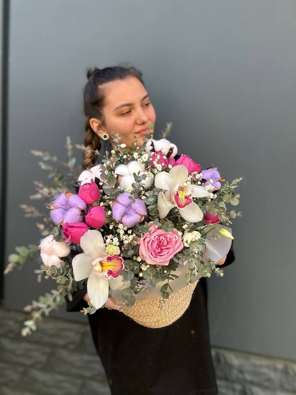 Белоснежные орхидеи и розовые розы собраны в природном джутовом кашпо. Воздушная гипсофила добавляет композиции легкости, а эвкалипт привносит свежие нотки.
