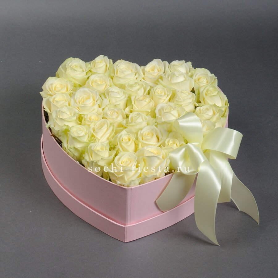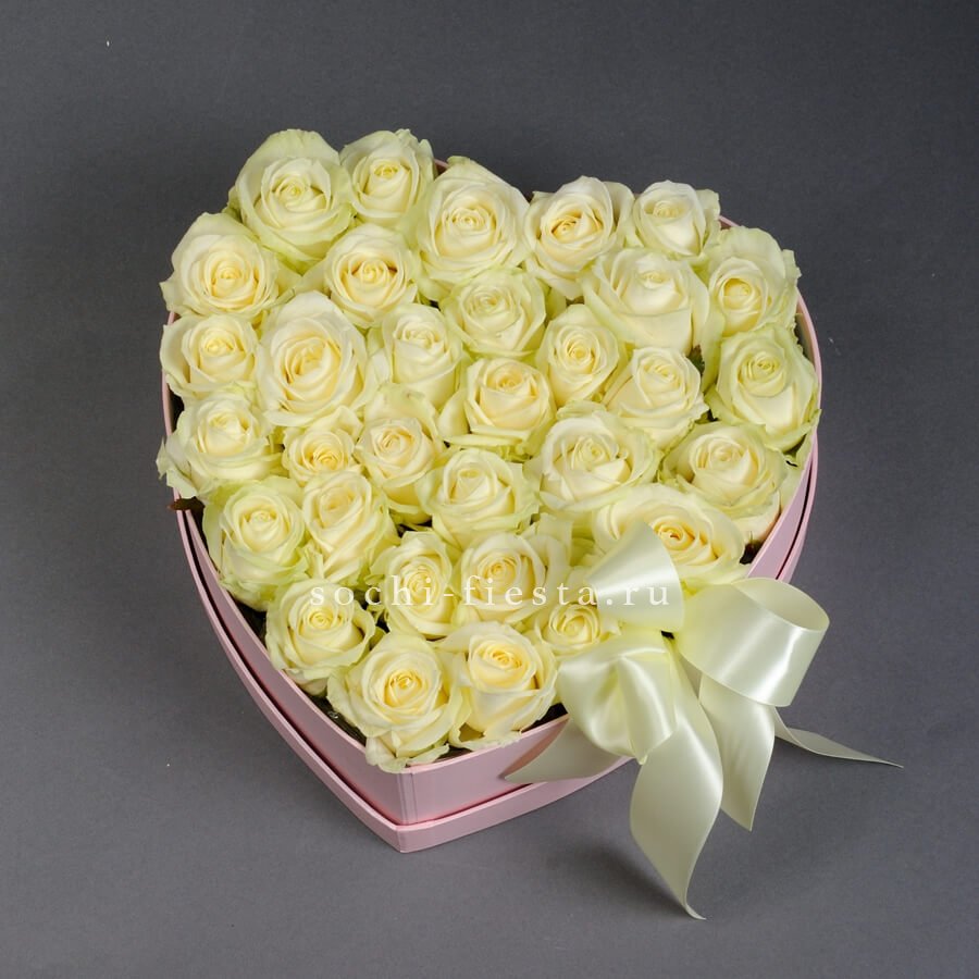 Двадцать пять белых роз образуют объёмную композицию с выразительным силуэтом. Плотная сборка и ритмичное расположение бутонов создают графичное впечатление.