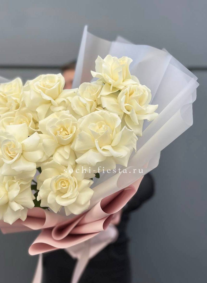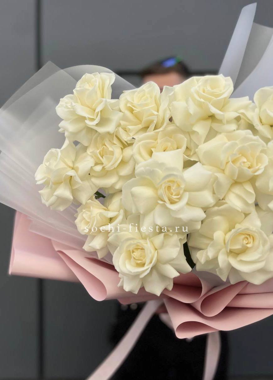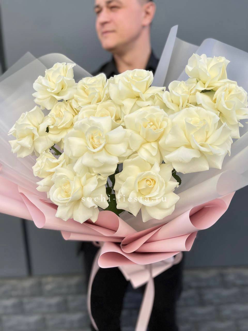 Пятнадцать вывернутых роз White Dream раскрываются широкими головками с волнистыми лепестками. Белый цвет переливается от молочного до холодного снежного оттенка. Французская селекция дарит букету объём и выразительную форму.