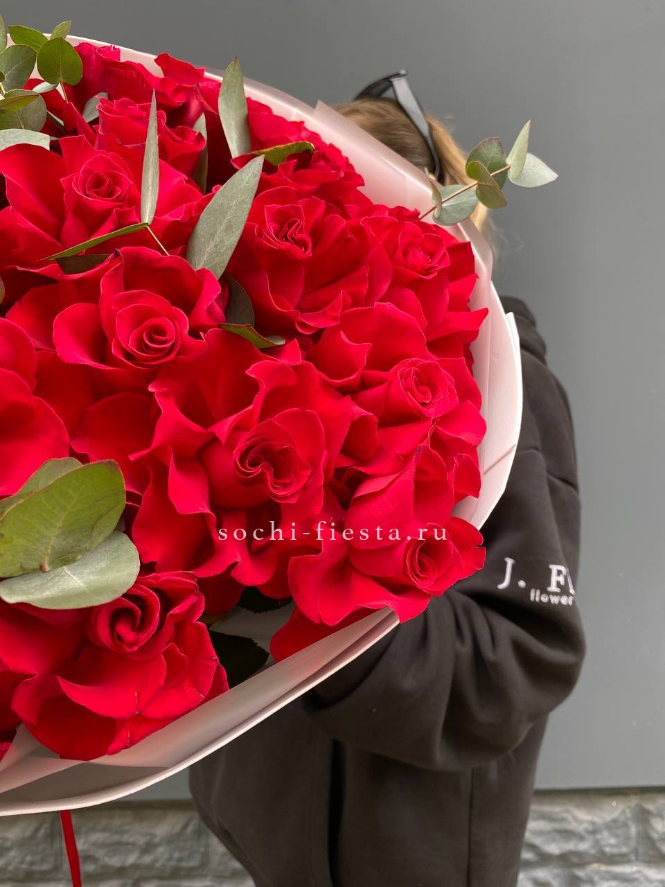 Двадцать три бутона выстроены в плотную округлую форму с чёткими линиями и выразительным силуэтом. Французские розы держат форму уверенно, а свежая зелень добавляет композиции графичности и завершённости.
