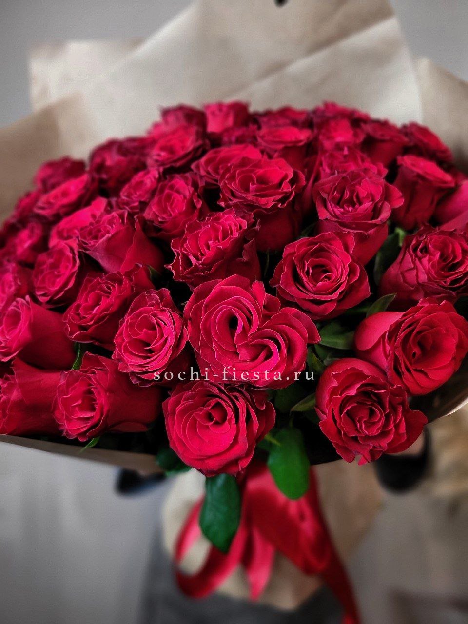 Шестьдесят три алых бутона собраны в плотный монохромный букет. Глубокий красный оттенок создаёт насыщенное цветовое пятно, которое притягивает взгляд и заполняет пространство вокруг.