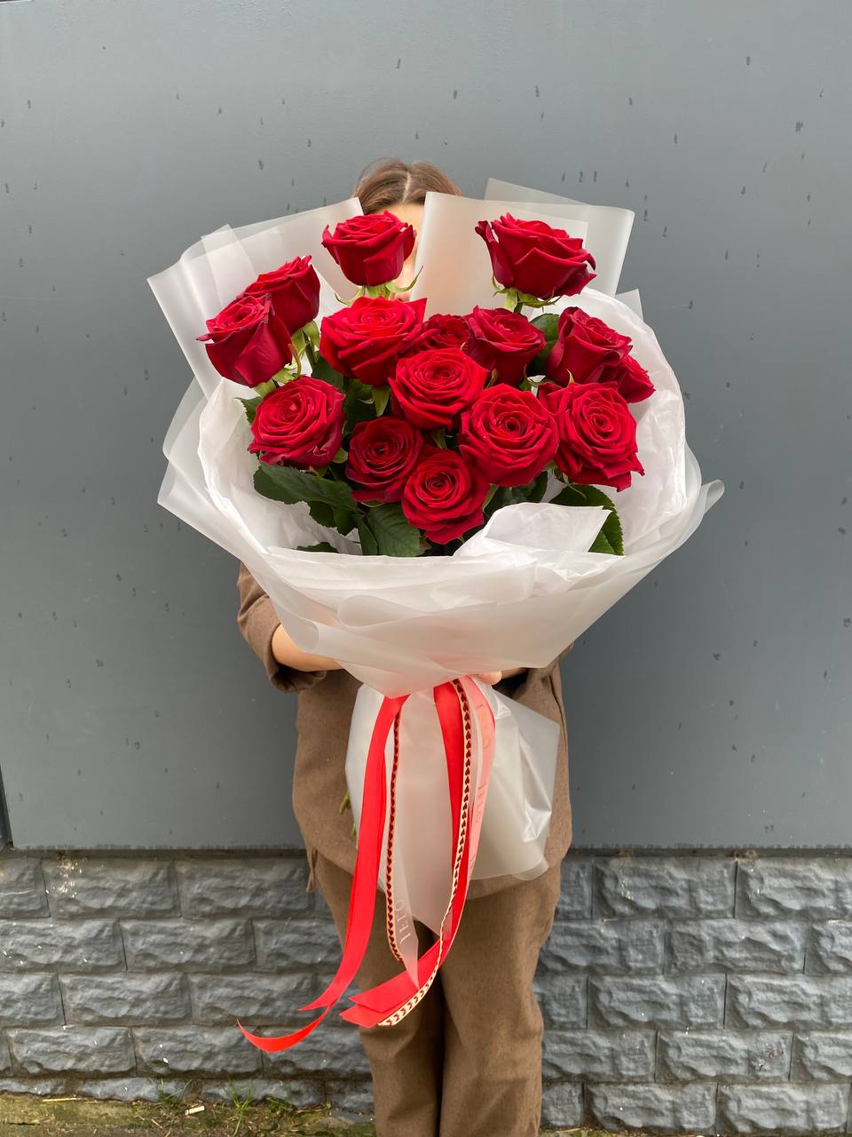 Французские розы с вывернутыми лепестками образуют пышную фактуру и глубину. Эвкалипт оттеняет насыщенность красного и придаёт букету свежесть.