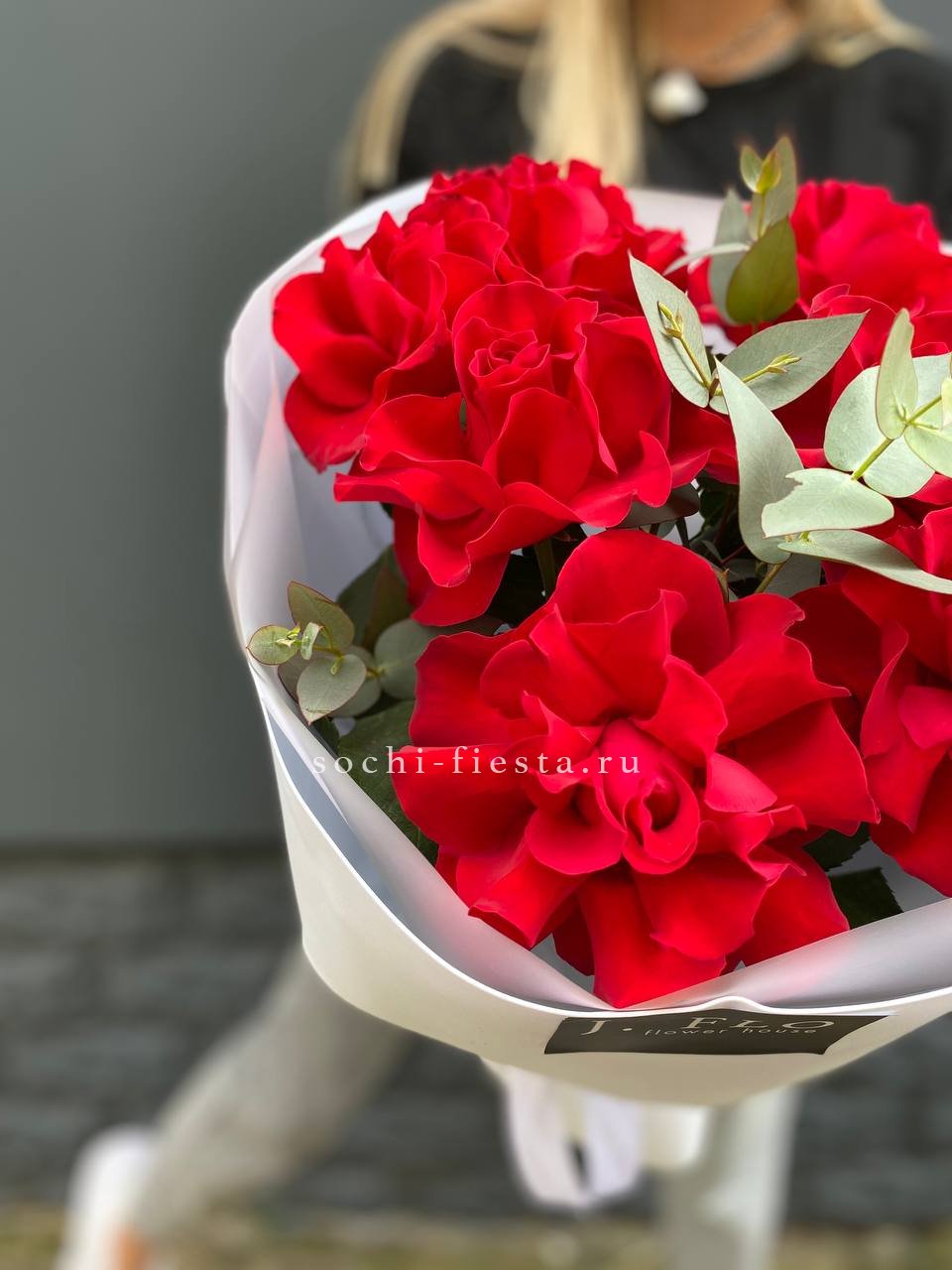 15 розовых роз, эвкалипт, дизайнерская упаковка.