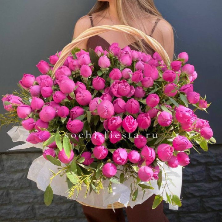 65 пионовидных кустовых роз в корзине