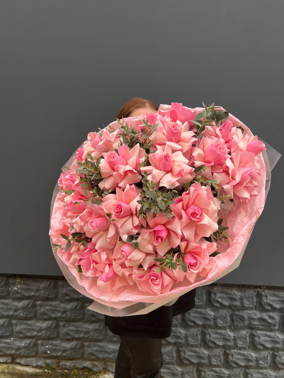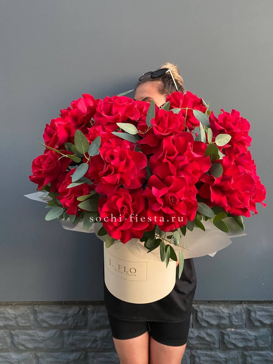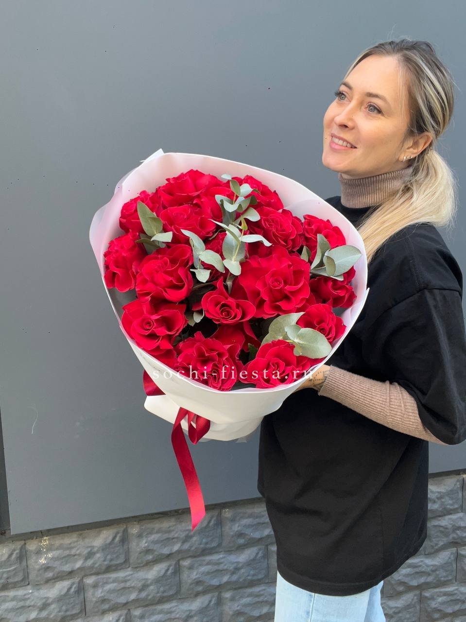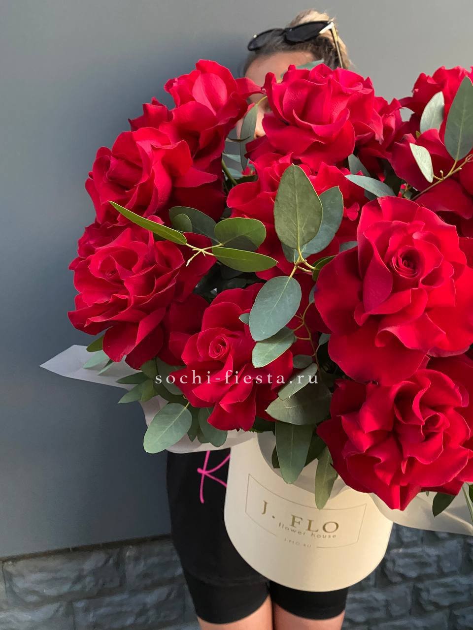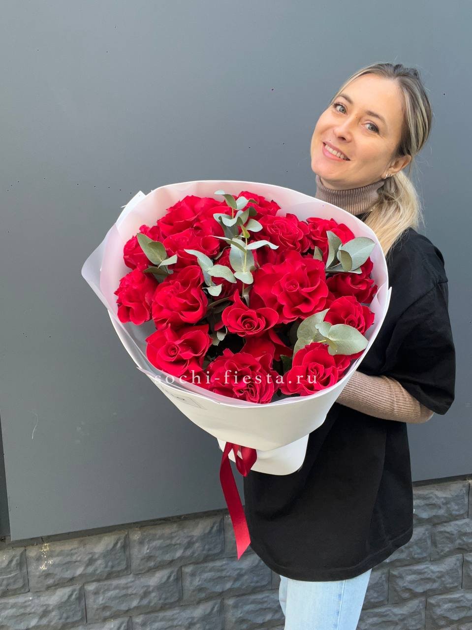 Глубокий красный тон распускающихся бутонов притягивает взгляд и удерживает внимание. Серебристая зелень эвкалипта создает прохладный фон для насыщенной палитры. Композиция в текстильном кашпо держит форму несколько дней.