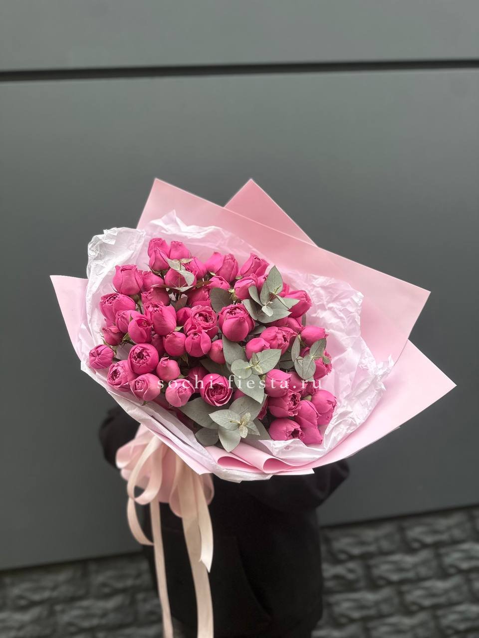 яркий букет из 11 пионовидных кустовых роз с эвкалиптом.