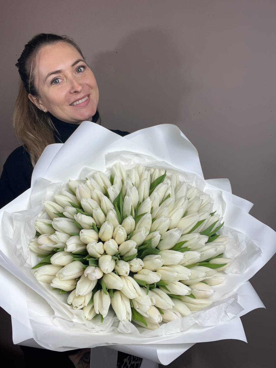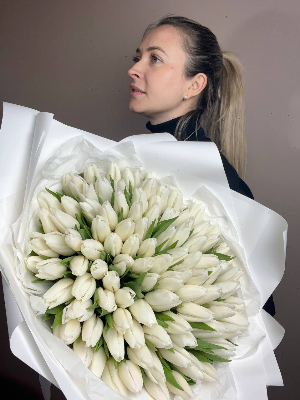 Тридцать одна веточка белых бутонов создаёт впечатляющий объём и заполняет пространство светлым сиянием. Плотная сборка и множество мелких головок формируют монументальную композицию с чистым силуэтом.
