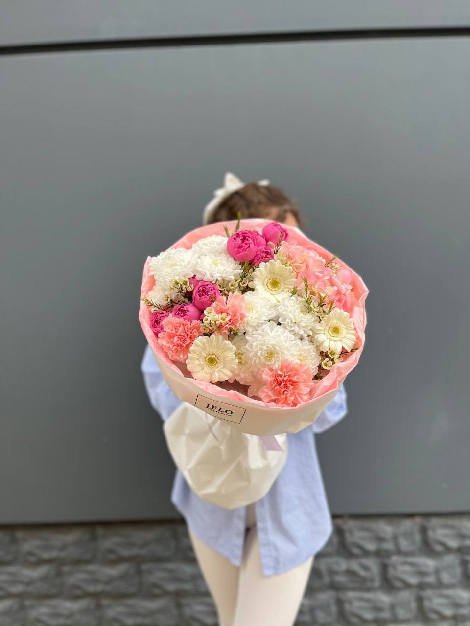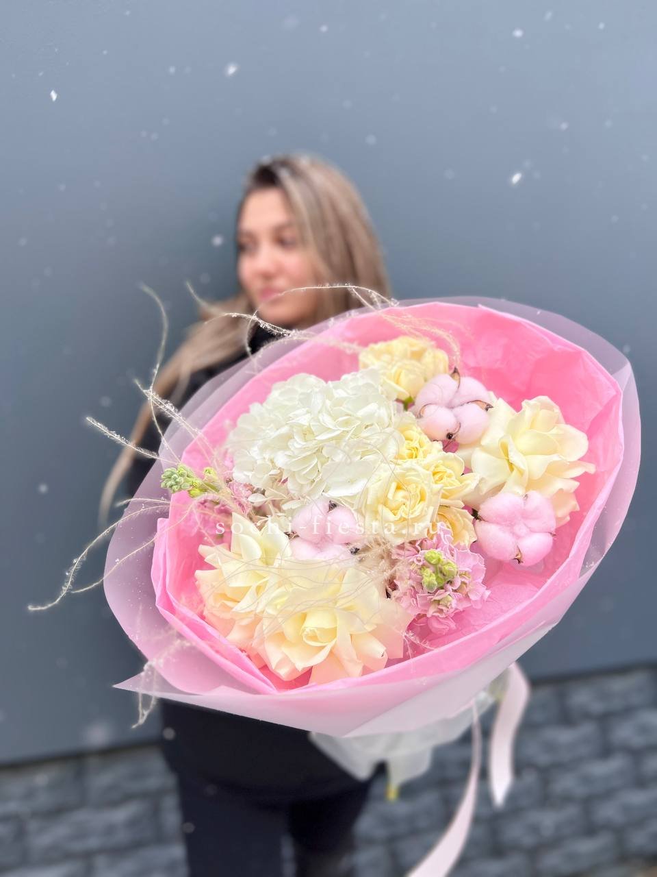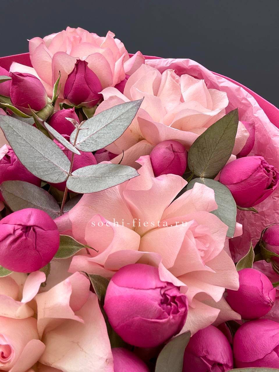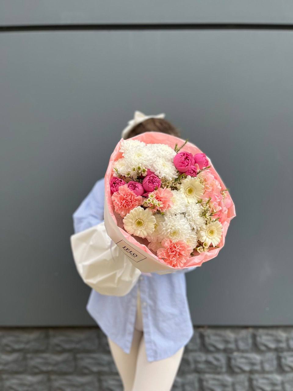 Плотные головки Мисти Бабблс раскрываются слоями и создают объёмную текстуру рядом с классическими бутонами. Белый и розовый перетекают друг в друга без резких границ. Композиция собрана в обёртку с графичным рисунком для современной подачи.